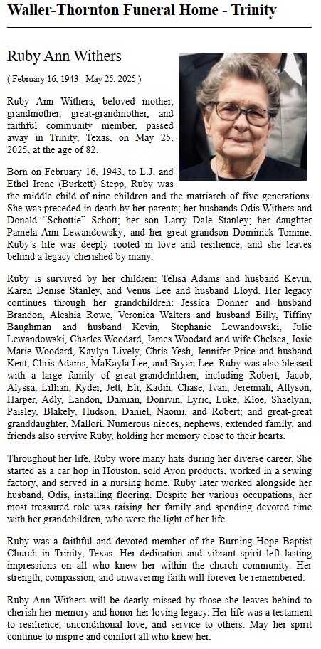 | YARBROUGH | Barbara Faye | Trinity County News Standard | 2/10/2022 |