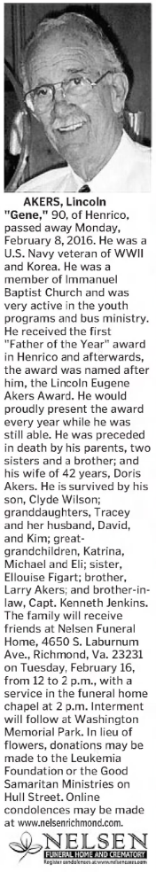 Richmond Times-Dispatch, Richmond, Virginia · Sunday, February 14, 2016 2016 Burial: Washington Memorial Park and Mausoleums, Sandston, Henrico Co., VA.
