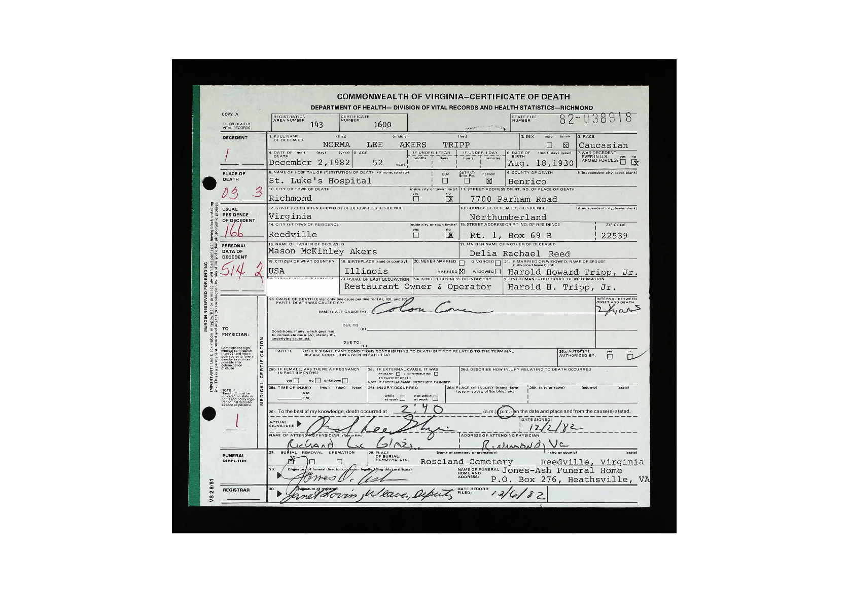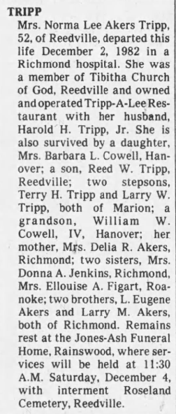 Parents: Mason McKinley Pop & Delia Sarah Rachel (Reed) Akers. 1930 Birth: 8-18-1930 VA. 1940 Residence: Henrico Co., VA with parents. Marriage #1: Norma 1st m. Frontice Clifton Flowers 1949 Richmond, VA. Divorced 1953 Richmond, VA. No children. Marriage #2: a Burleson. 1962 Marriage #3: Harold Howard Tripp Jr, 1930-1917,