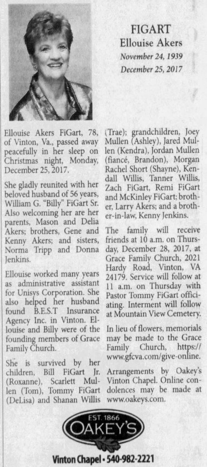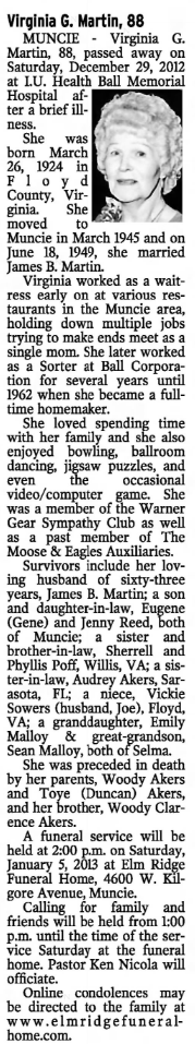 Parents: Woody Isaac & Toye Nettie (Duncan) Akers. 1924 Birth: abt 1924 VA. 1930 Residence: Radford City, VA with parents. 1940 Residence: Floyd Co., VA with parents. 1943 Marriage #1: Gertrude Akers m. Willard Reed 9-1-1943 Floyd Co., VA. He 24 yo single w/m ex soldier, b. Floyd, s/o Abraham Reed & Minerva Alley. She 19 yo single w/f, b. Floyd, d/o Woodie Akers & Toy Duncan. Willard Taylor Reed, 1919-1976, s/o Abraham Taylor & Minerva Susan (Alley) Reed. [Reed_MarkA_LucyA] Divorce: Virginia & Willard divorced 1946 Delaware Co., IN. 1949 Marriage #2: Virginia G. Reed m. James B. Martin 6-18-1949 Delaware Co., IN. James Barnum Martin, s/o Jack L. D. & Dorothy Irene (Taylor) Martin. 2012 Death: 12-29-2012 of 1104 West Haines Ave, Muncie, Delaware Co., IN.