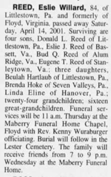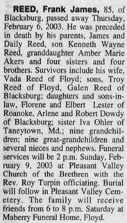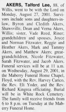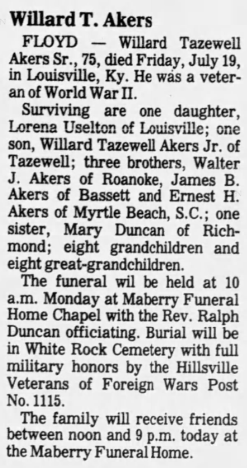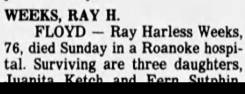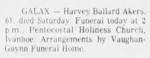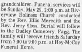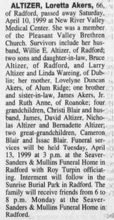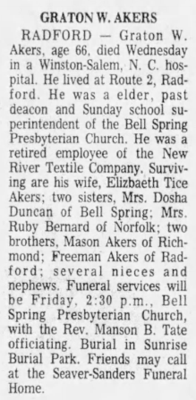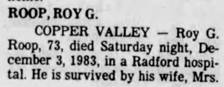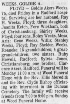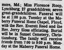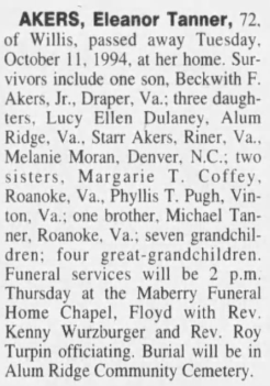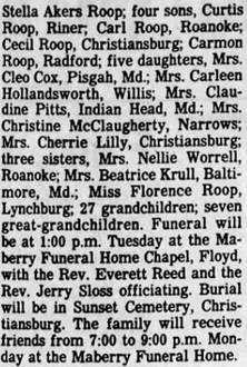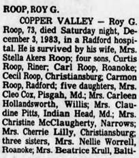 Roanoke Times and World-News, Roanoke, Virginia · Friday, October 23, 1987 1987 Burial: White Rock Cemetery, Alum Ridge, Floyd