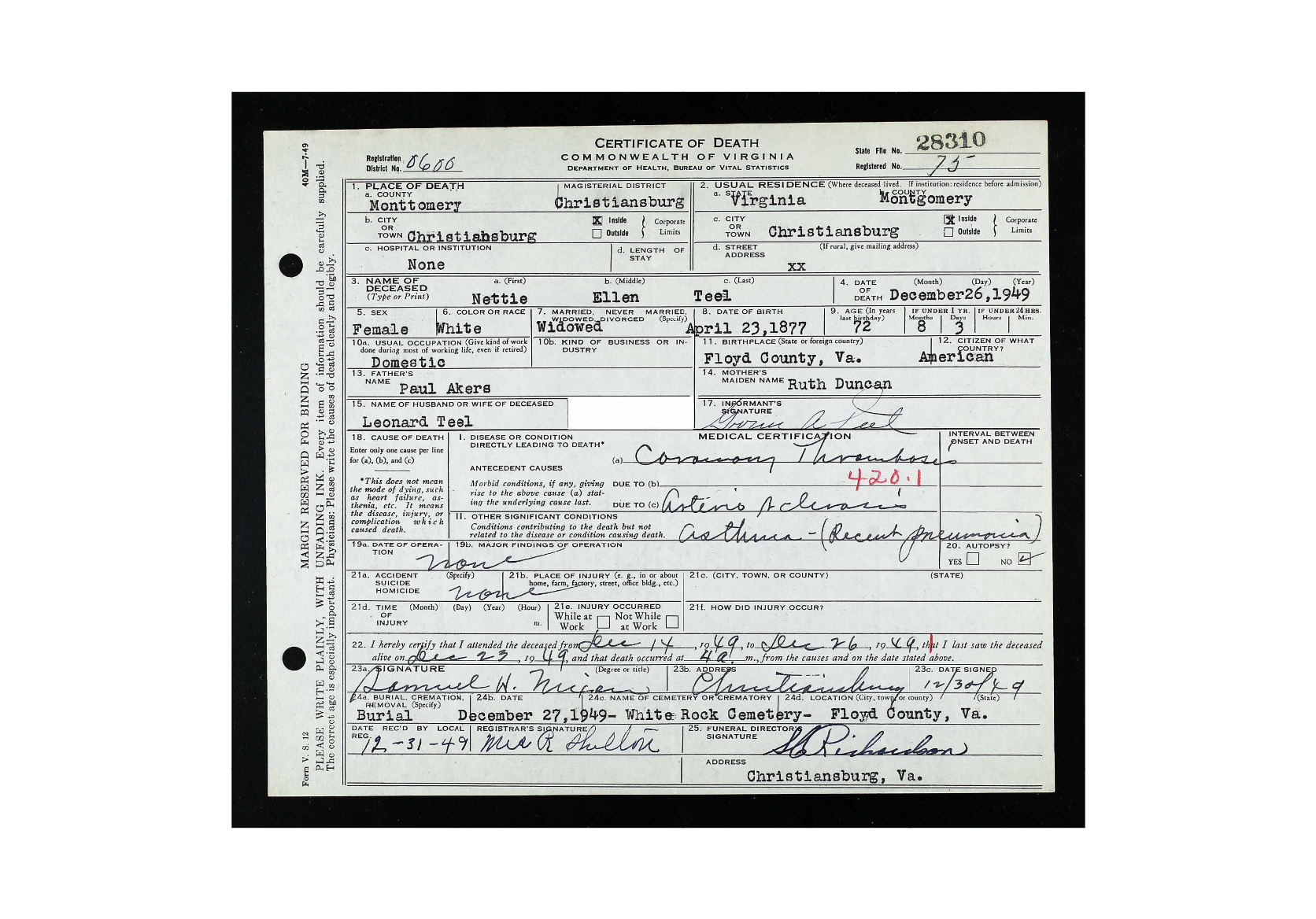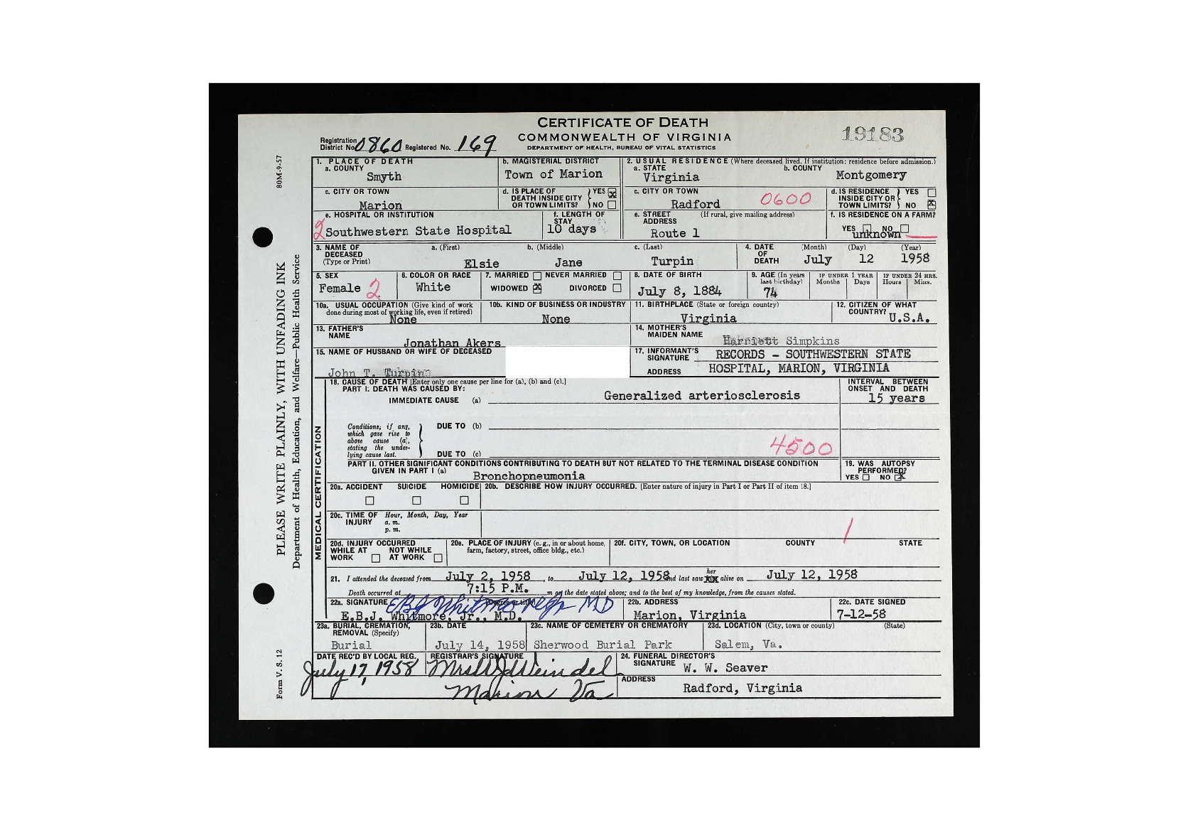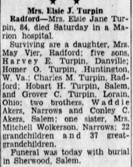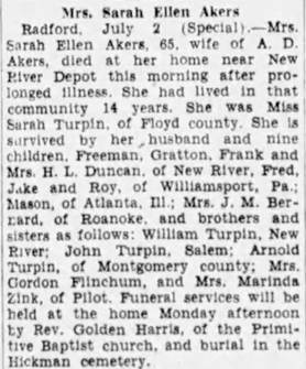 with husband Arteamus Dudley Akers. 1920, 1930 Residence: Pulaski Co., VA with husband Arteamus Dudley Akers. 1932 Death: 7-2-1932 Dublin District, Pulaski Co., VA. Sarah Ellen Akers, 64y 6m 18d, married w/f, b. Dec 14, 1867 Pulaski Co., VA. Spouse: A. D. Akers. Father: Thomas Turpin, b. unknown. Mother: Sarah Simpkins, b. unknown. Informant: A. D. Akers of New River Depot, VA. COD: cancer of right breast 3 years. Burial: New River, July 4, 1932.