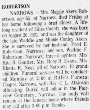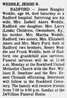 Clinch Valley News and Richlands Press, Bristol, Virginia · Wednesday, January 06, 1982 1981 Burial: Valley Vista Cemetery, Bluefield, VA. (no photo as of Mar 2026) |