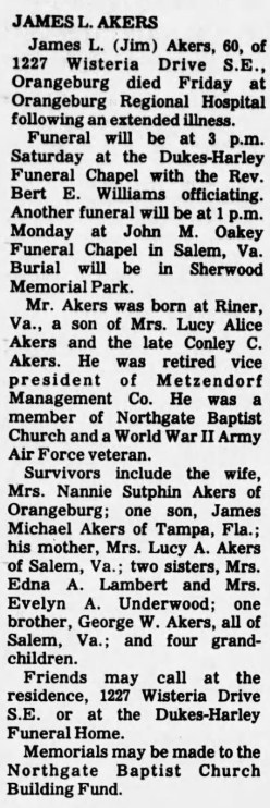 Richmond Times-Dispatch, Richmond, Virginia · Friday, August 13, 1982 1982 Burial: Dale Memorial Park, Chesterfield Co., VA.