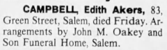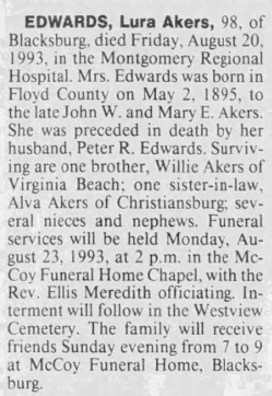 Parents: William Charlton & Mary Jane (Alley) Akers. 1886 Birth: 11-15-1886 Floyd Co., VA. 1890, 1900 Residence: Floyd Co., VA with parents. 1911 Marriage #1: Deliah M. Akers m. Edward L. Farley 5-1-1911 Giles Co., VA. He 23 yo single w/m laborer, b. Summers, s/o Jno. A. & M. She 23 yo single w/f, b. Floyd, d/o Wm & M. J. Robert Edward L. Farley, 1886-1940, s/o John & Menervia (Ford) Farley. 1981 Death: 12-30-1981 of Ben Bolt Ave, North Tazewell, Tazewell Co., VA. [Death Cert]