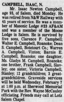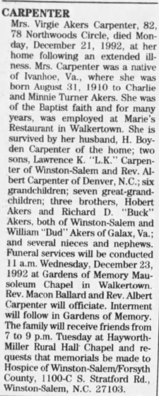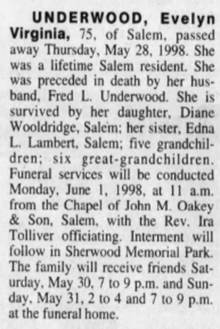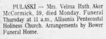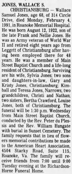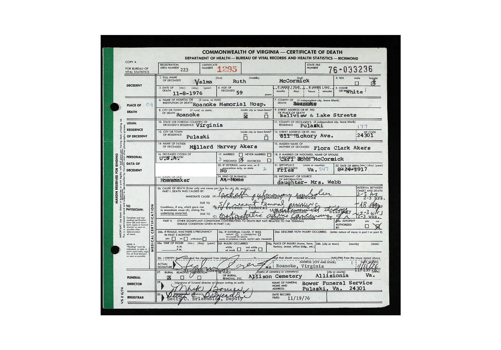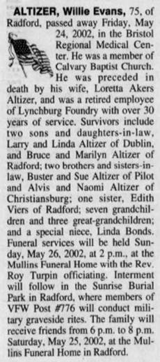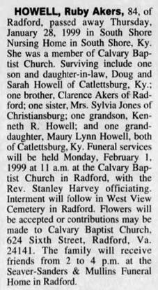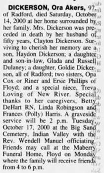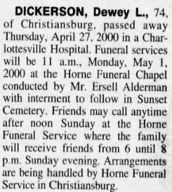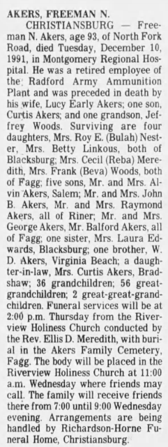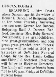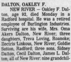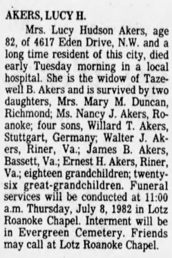 The Roanoke Times, Roanoke, Virginia · Friday, November 19, 1982 1982 Burial: Hickman Cemetery, Radford City, VA.