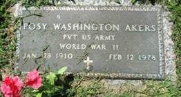 Parents: James Wallace & Arminta Alice Mintie (Flinchum) Akers. 1910 Birth: 1-28-1910 Narrows, Giles Co., VA. 1910, 1920, 1930, 1940 Residence: Giles Co., VA with parents. 1978 Death: 2-12-1978 Narrows, Giles Co., VA. Posey Washington Akers, 68 yo w/m, never married retired laborer, b. Jan 28, 1910 Narrows, Giles Co., VA. Veteran: WW II. Father: James Wallace Akers. Mother: Mintie Alice Flentchen. Informant: Mr. James B. Akers. COD: ventricular fibrillation. Burial: Fairview Cemetery, Narrows, VA. No burial date.