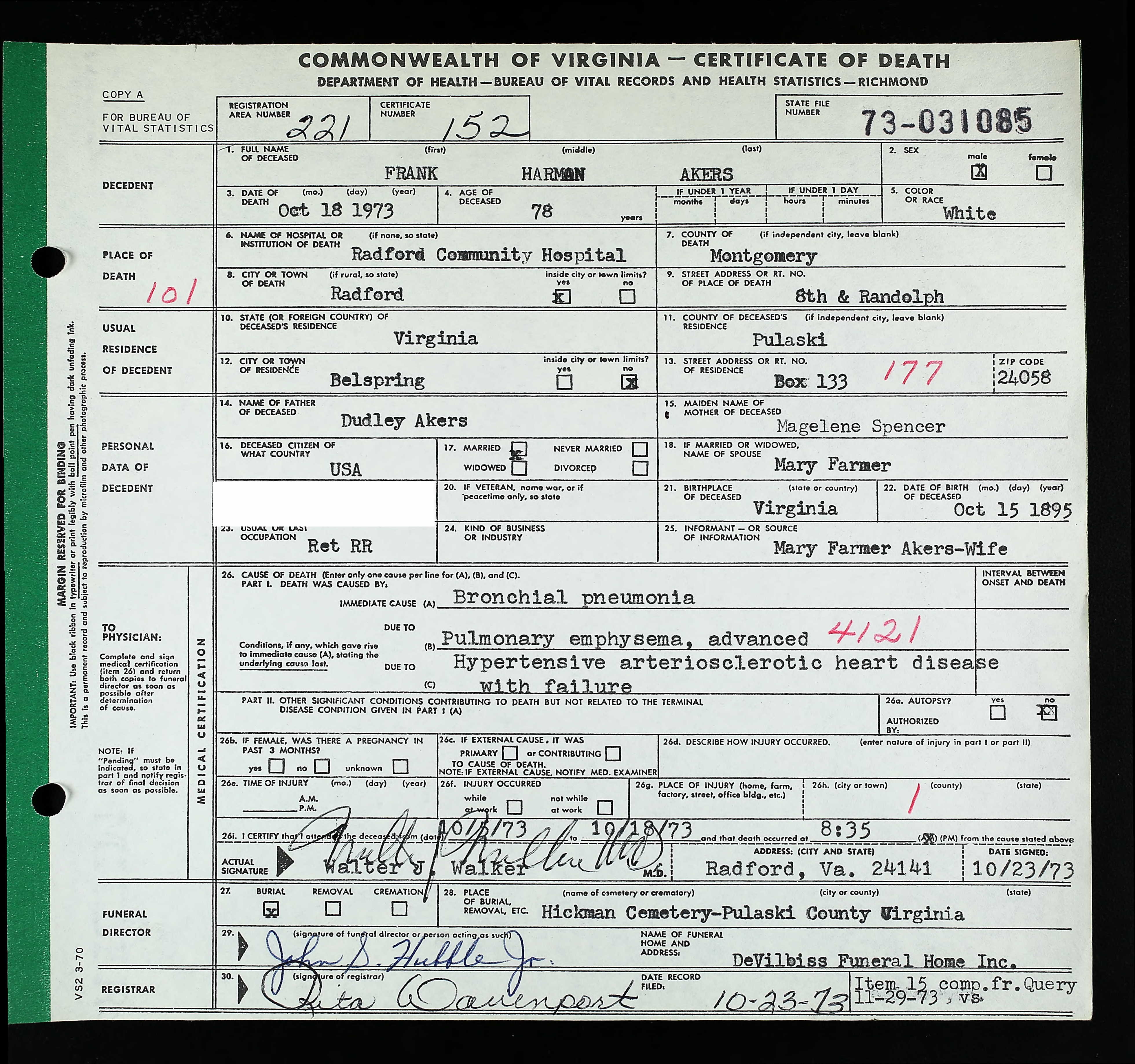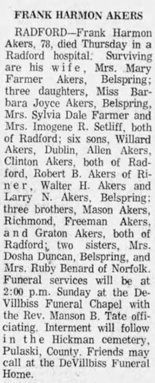 Parents: Arteamus Dudley & Sarah Ellen (Turpin) Akers. 1894 Birth: 10-15-1894 Copper Valley, Floyd Co., VA. 1900, 1910 Residence: Floyd Co., VA with parents. 1917 Registration Card: Frank Akers, 22 yo w/m of Wheatland, North Dakota, b. Oct 15, 1894 Copper Valley, Virginia, farm hand for W. F. Schultz of Gill Twp., ND, medium height & build, blue eyes & light hair. Dated June 5, 1917 Gill Precinct, Cass Co., ND. 1927 Marriage #1: Nannie Haven Linkous 1927. Nannie Haven Linkous, 1909-1937, d/o James William & Mary Ann (Anderson) Linkous. Marriage #2: Mary Farmer. Mary Farmer, d/o Robert Graham & Mary Emeline (Duncan) Farmer. 1920: too many possibilities. 1942 Registration Card: cant find. 1973 Death: 10-18-1973 Radford, VA but of Belspring, Pulaski Co., VA. [Death Cert]