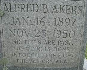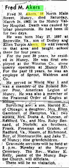 Parents: Arteamus Dudley & Sarah Ellen (Turpin) Akers. 1897 Birth: 5-27-1897 Pulaski Co., VA. 1900, 1910 Residence: Floyd Co., VA with parents. 1918 Registration Card: Fred Akers, 21 yo single w/m of Copper Valley, VA, b. May 27, 1897 Pulaski Co., VA, farming for father A. D. Akers, medium height & build, blue eyes & light hair. Dated June 2, 1918 Floyd Co., VA. 1920 Residence: Pulaski Co., VA with parents. 1926 Marriage #1: Jennie Pearl Hunsinger abt 1926. Jennie Pearl Hunsinger, b. PA, 1905-1989, d/o John Alvin & Mary Emma (Roberts) Hunsinger. Jennie m. 2nd Earl Truman Murray. 1962 Death: 3-24-1962 of Muncy, Lycoming Co., Pennsylvania.