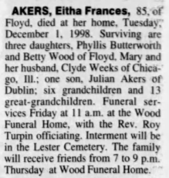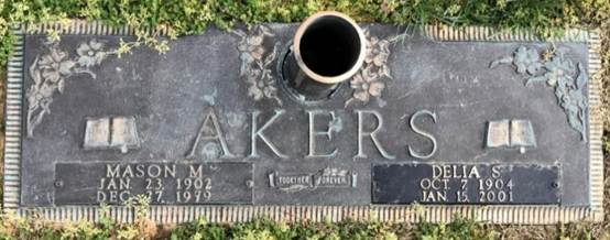 Parents: Arteamus Dudley & Sarah Ellen (Turpin) Akers. 1902 Birth: 1-23-1902 Floyd Co., VA. 1910 Residence: Floyd Co., VA with parents. 1920 Residence: Pulaski Co., VA with parents. 1922 Marriage #1: Mason M. Akers m. Delia S. Reed 2-15-1922 Floyd Co., VA. He 21 yo single w/m, b. Floyd Co., VA, s/o A. D. & Sarah E. Akers. She 17 yo single w/f, b. Floyd Co., VA, d/o Spencer & Laura Reed. 1930 Residence: McClean Co., IL, Mount Hope District 53, H33: Reed, Mason M. 29 yo w/m grain farm laborer, b. VA, parents b. VA, 21 yo when 1st married, rents, vet?: no, HOH. Delia 25 yo wife, b. VA, parents b. VA, 17 yo when 1st married. Kenneth T. 7 yo son, b. VA, parents b. VA. Eugene L. 4 yo son, b. IL, parents b. VA. 1940 Residence: Henrico Co., VA, Varina District 44-34, Oakland Road, H15: Akers, Mason M. 39 yo w/m dairy milker, b. VA, completed G7, resided in same place 1935, rents, HOH. Delia S. 35 yo wife, b. VA, completed H2, resided in same place 1935, housework. Kenneth T. 17 yo son, b. VA, completed H3, resided in same place 1935, school. Eugene L. 15 yo son, b. IL, completed G1, resided in same place 1935, school. Norma Lee 9 yo daughter, b. IL, completed G3, resided in same place 1935, school. Eloise 6/12 daughter, b. VA, completed G0. Reed, Bonnie 16 yo single sister in law, b. VA, completed H2, resided in Floyd Co., VA 1935, other work. 1979 Death: 12-27-1979 Richmond, Chesterfield Co., VA. [Death Cert]