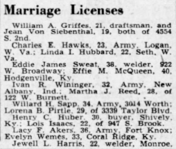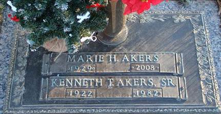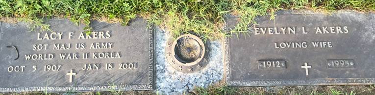 with parents. 1930 Residence: Anne Arundel Co., Maryland, Fort George G. Meade: Akers Lacey F. 23 yo w/m soldier, b. VA, parents b. VA. 1940: 1946 Marriage #1: He m. Evelyn Lillian Wemes 3-9-1946 KY. Evelyn Lillian Wemes, 1912-1995, d/o Isaac & Mary (Gagel) Wemes. [Death Cert]