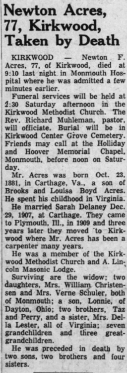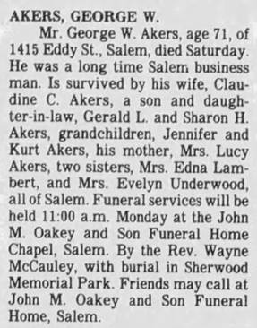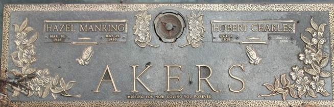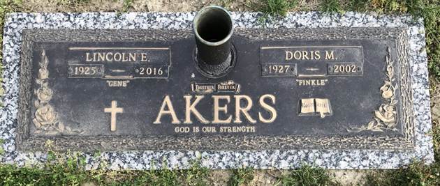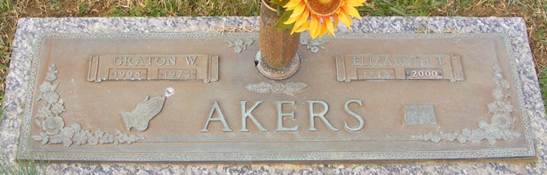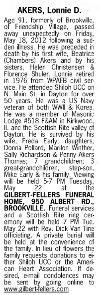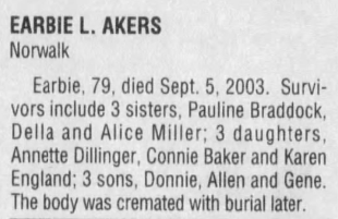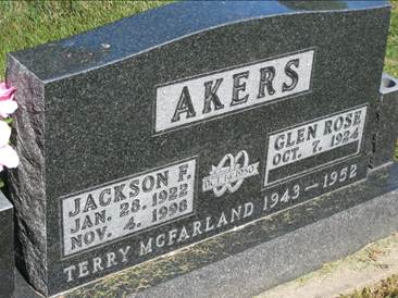 Parents: Fuller Roscoe & Nancy Alice (Akers) Akers 1922 Birth: 1-28-1922 IL. 1930, 1940 Residence: Hancock Co., IL with parents. 1950 Marriage #1: Glen Rose Goldsberry 10-14-1950. Glen Rose Goldsberry, 1924-2024, d/o Ernest Leo & Alma (Wrightsman) Goldsberry. 1998 Death: 11-4-1998. 1998 Burial: Oakwood Cemetery, Hamilton, Hancock Co., IL.