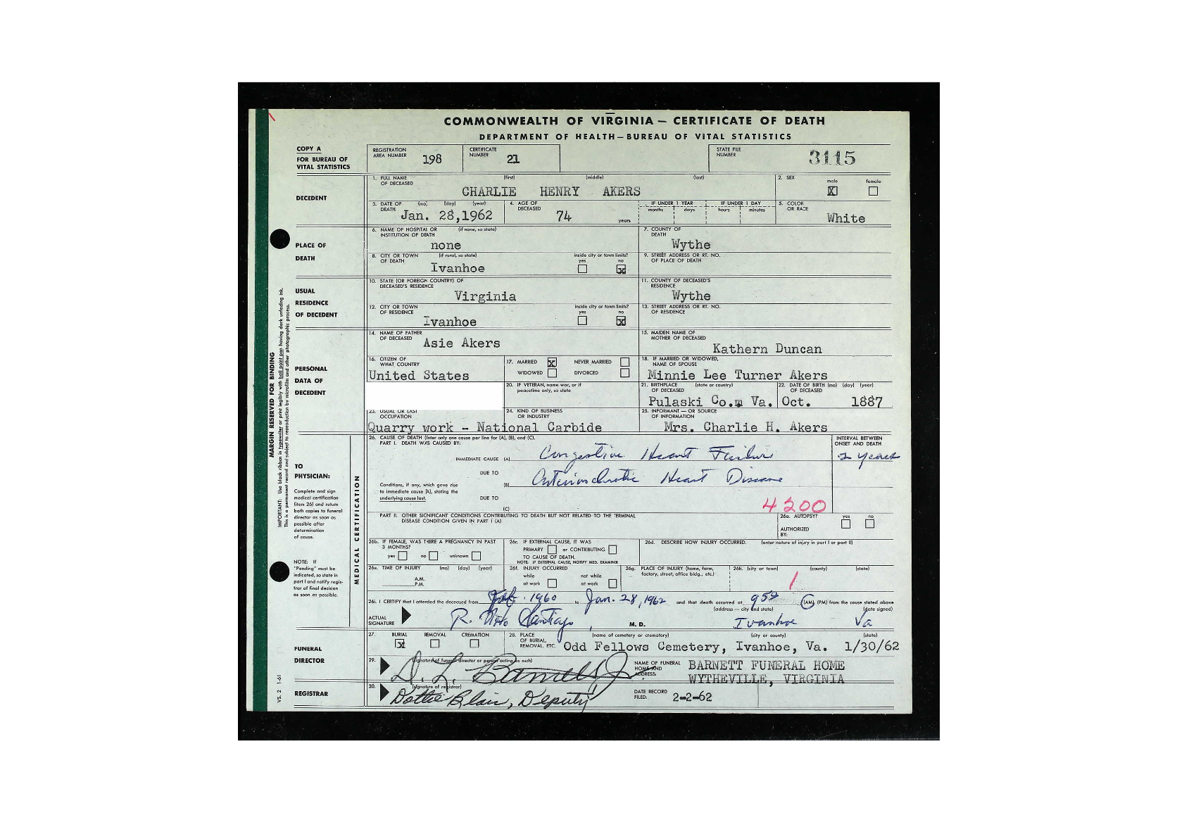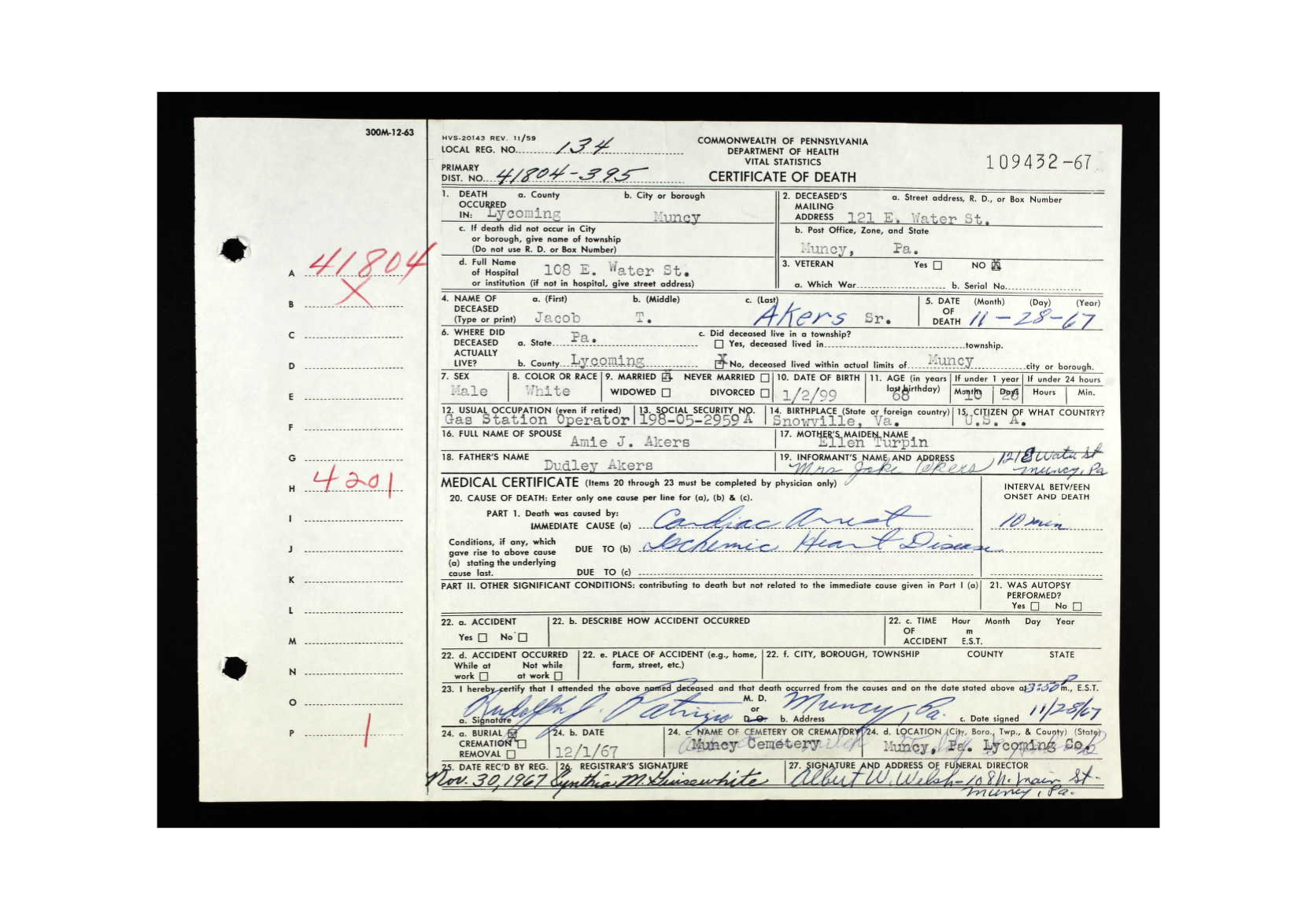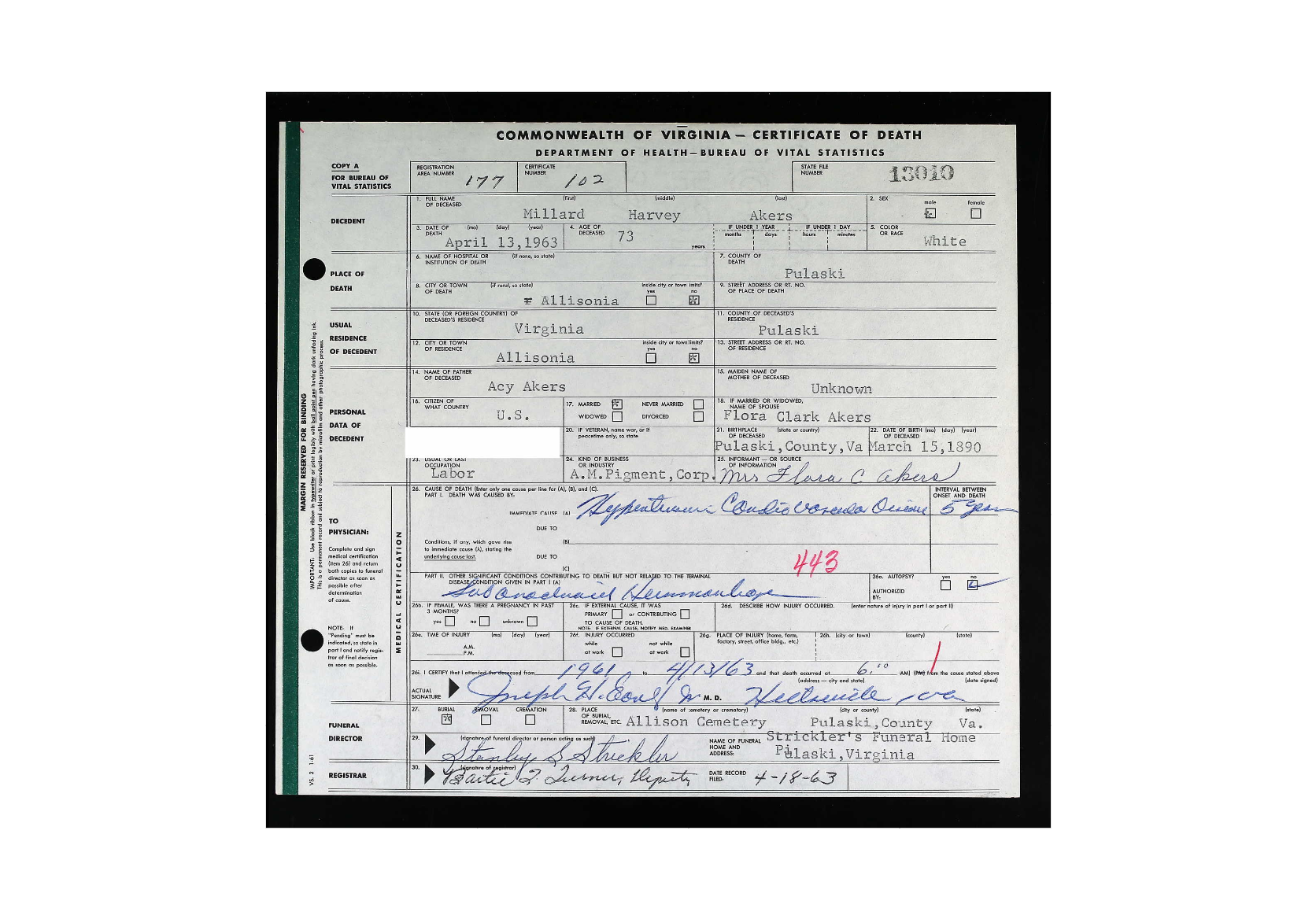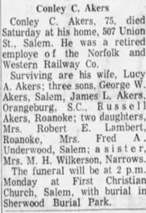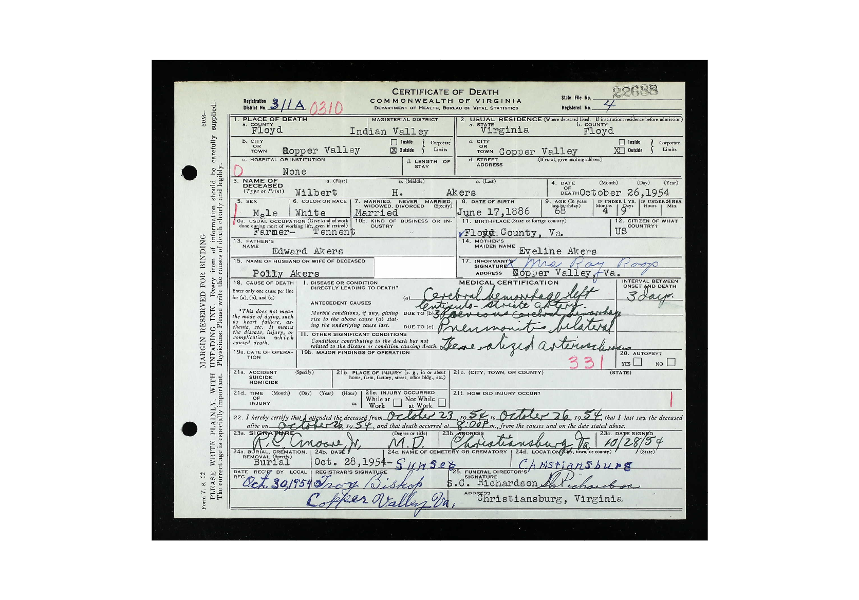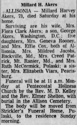 Parents: Arteamus Dudley & Sarah Ellen (Turpin) Akers. 1898 Birth: 12-1898 VA. (src: 1900 census) 1898 Birth: 1-2-1898 Floyd Co., VA. (src: delayed birth record but deemed lack of written evidence cannot certify this birth.) 1900, 1910 Residence: Floyd Co., VA with parents. 1920 Residence: Pulaski Co., VA with parents. 1926 Marriage #1: Amie Jane Hill 1-17-1926 Radford, VA. Amie Jane Hill, b. East Radford, VA, 1909-1978, d/o Stokley & Mary C. (Willis) Hill. 1967 Death: 11-28-1967 Muncy, Lycoming Co., Pennsylvania. [PA Death Cert] 1967 Burial: Muncy Cemetery, Muncy, Lycoming Co.,
