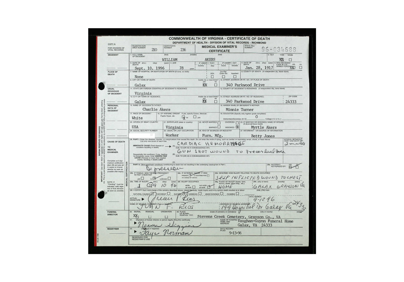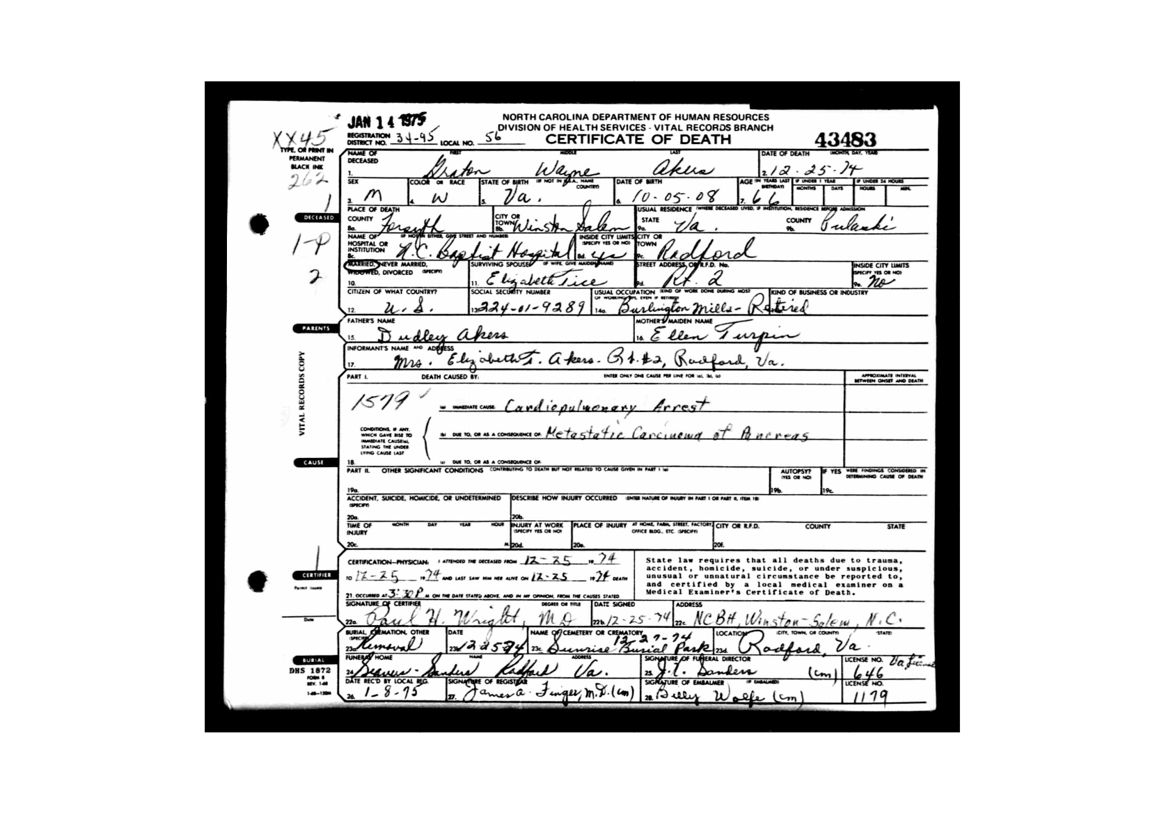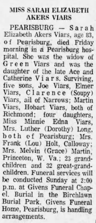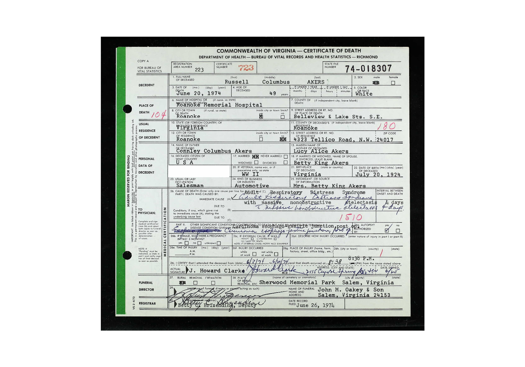 Parents: Arteamus Dudley & Sarah Ellen (Turpin) Akers. 1898 Birth: 12-1898 VA. (src: 1900 census) 1898 Birth: 1-2-1898 Floyd Co., VA. (src: delayed birth record but deemed lack of written evidence cannot certify this birth.) 1900, 1910 Residence: Floyd Co., VA with parents. 1920 Residence: Pulaski Co., VA with parents. 1926 Marriage #1: Amie Jane Hill 1-17-1926 Radford, VA. Amie Jane Hill, b. East Radford, VA, 1909-1978, d/o Stokley & Mary C. (Willis) Hill. 1967 Death: 11-28-1967 Muncy, Lycoming Co., Pennsylvania. [PA Death Cert] 1967 Burial: Muncy Cemetery, Muncy, Lycoming Co.,