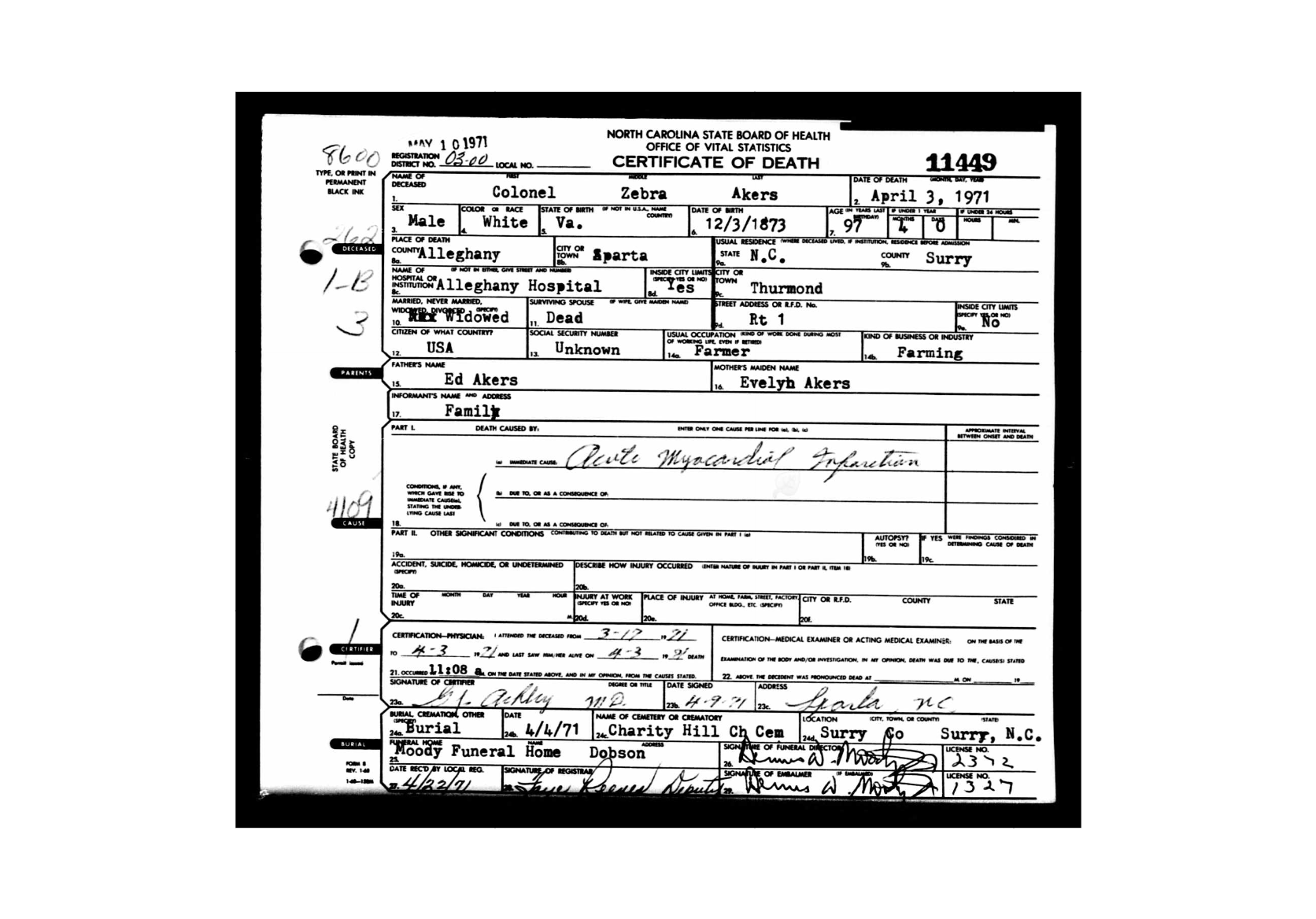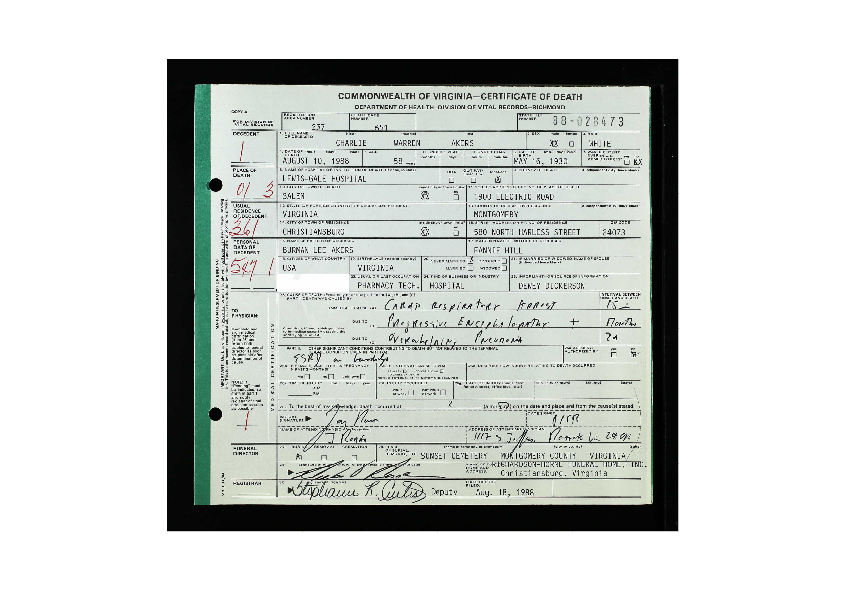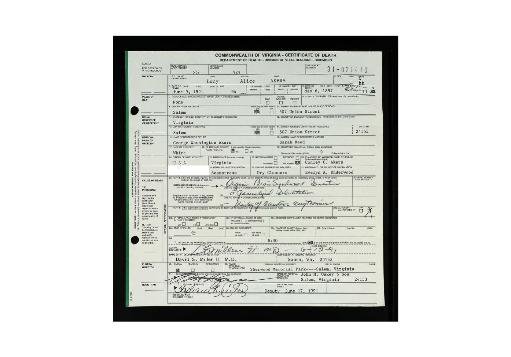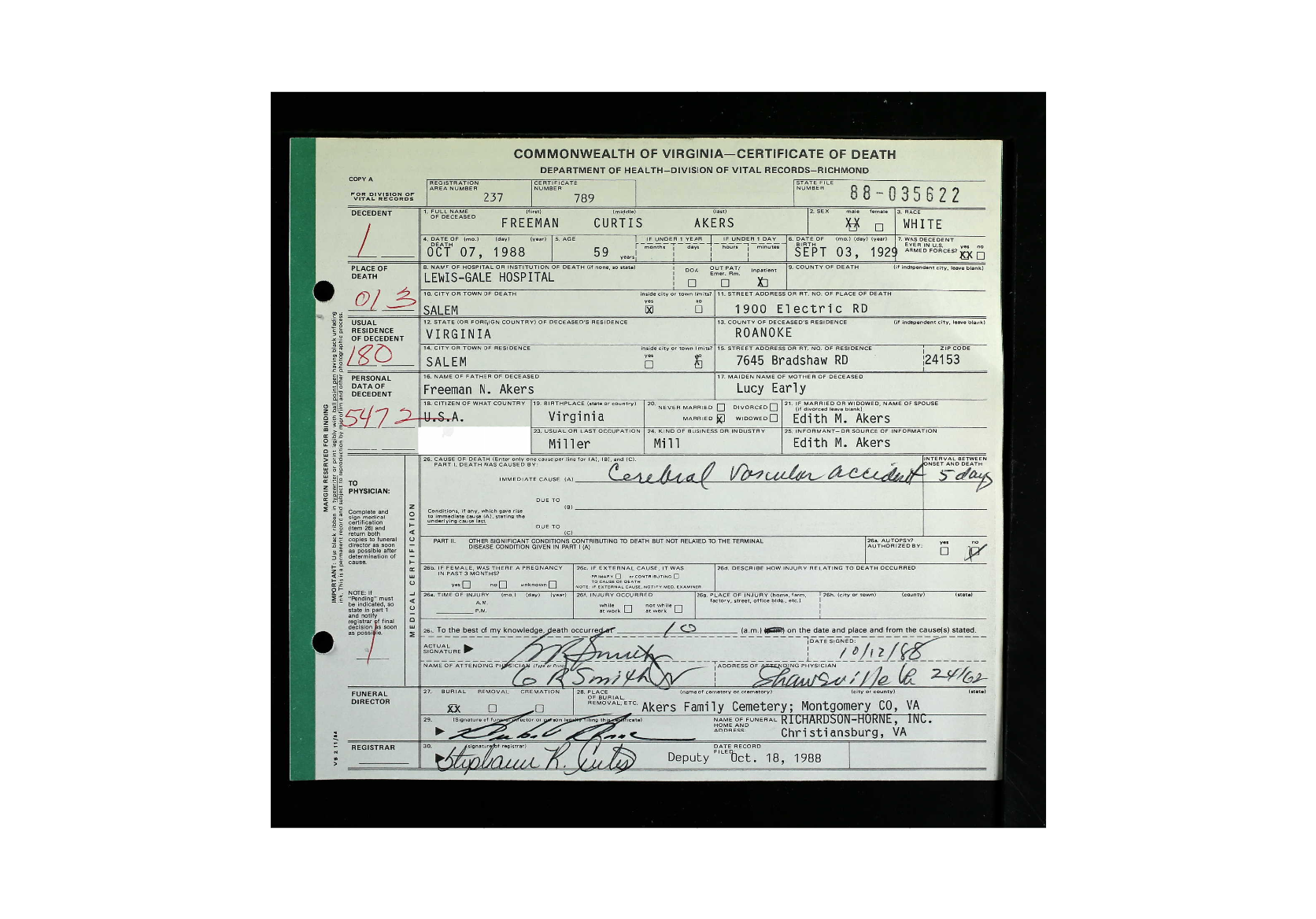 Parents: Arteamus Dudley & Sarah Ellen (Turpin) Akers. 1898 Birth: 12-1898 VA. (src: 1900 census) 1898 Birth: 1-2-1898 Floyd Co., VA. (src: delayed birth record but deemed lack of written evidence cannot certify this birth.) 1900, 1910 Residence: Floyd Co., VA with parents. 1920 Residence: Pulaski Co., VA with parents. 1926 Marriage #1: Amie Jane Hill 1-17-1926 Radford, VA. Amie Jane Hill, b. East Radford, VA, 1909-1978, d/o Stokley & Mary C. (Willis) Hill. 1967 Death: 11-28-1967 Muncy, Lycoming Co., Pennsylvania. [PA Death Cert] 1967 Burial: Muncy Cemetery, Muncy, Lycoming Co.,