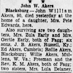 Parents: William Charlton & Mary Jane (Alley) Akers. 1897 Birth: 5-30-1897 Floyd Co., VA. 1900 Residence: Floyd Co., VA with parents. 1910 Residence: Montgomery Co., VA, Christiansburg District 100, along road & section from McAdams Road & Vicars Switch on the N. & W. R. R., H240: