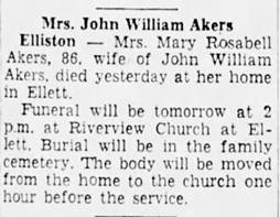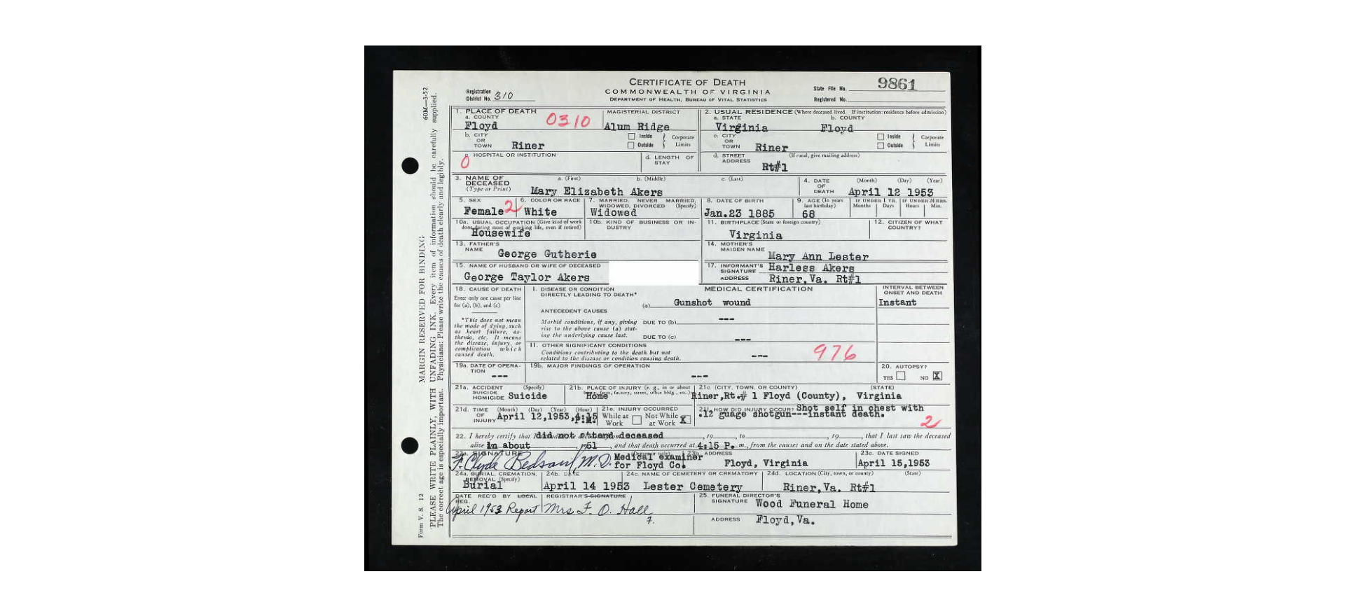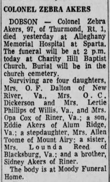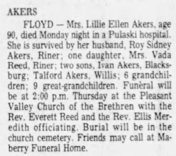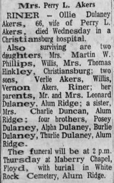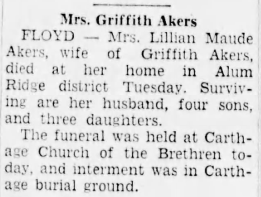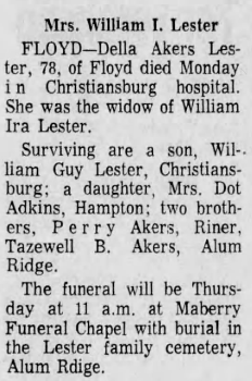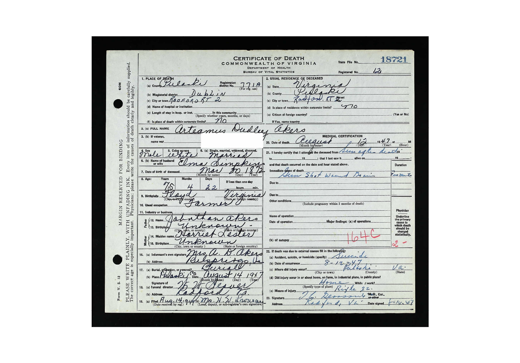 farmer, b. VA, parents b. VA, 21 yo when married, owns, HOH. Sarah E. 62 yo wife, b. VA, 24 yo when married. Freeman L. 26 yo single son, b. VA, parents b. VA, farm laborer. Graton W. 21 yo single son, b. VA, parents b. VA, laborer road construction. Teel, Maranda 70 yo widowed sister-in-law, b. VA, parents b. VA, 21 yo when 1st married. 1933 Marriage #2: A. D. Akers m. Ella Simpkins Wilson 11-8-1933 Radford, VA. He 61 yo s/o Jonathan Akers & Harriett Lester. She 38 yo d/o Truman Simpkins & Delia Ridpath. Ella, aka Gracie Alma/ Elma, d/o Truman & Cordelia (Ridpath) Simpkins. [Death Cert] 1947 Death: 8-21-1947 Belspring, Pulaski Co., VA. [Death Cert] Arteamus Dudley Akers, 75y 4m 22d, married w/m farmer, b. Mar 20, 1872 Floyd Co., VA. Spouse: Elma Simpkins. Father: Johnthan Akers, b. unknown. Mother: Harriet Lester, b. unknown. Informant: Mrs. A. D. Akers of Belspring, VA. COD: gunshot wound brain minutes rifle 22 suicide. Burial: Pulaski Co., Aug 14, 1947. 1947 News Clips: (src: Find A Grave) Farmer Near Belspring