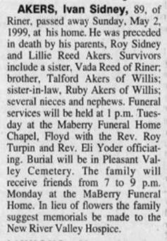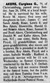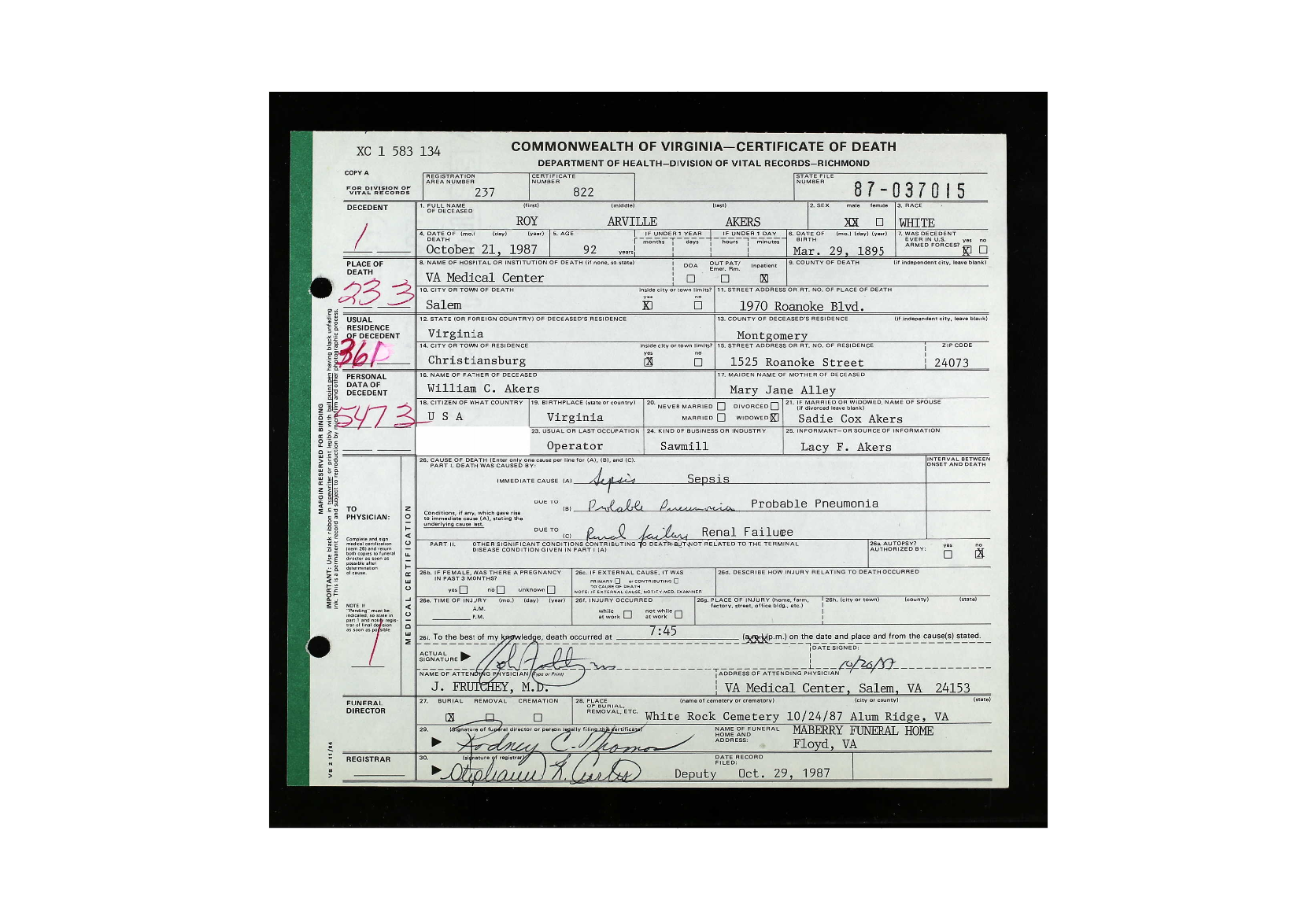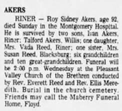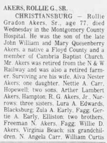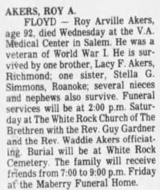 Sadie 42 wife, b. VA, completed G5, resided in same house 1935, housework. 1942 Registration Card: Roy Arville Akers, 47 yo w/m of Carthage, Floyd Co., VA, b. March 29, 1895 Floyd Co., VA, person who will always know address: Mrs. Roy A. Akers, employer: self, 5 11 175 lbs, blue eyes, bald, ruddy complexion. 1987 Death: 10-21-1987 VA Hospital, Salem, VA but of 1525 Roanoke St, Christiansburg, Montgomery Co., VA. [Death Cert] Roy Arville Akers, 92 yo widowed w/m sawmill operator, b. Mar 29, 1895 VA. Spouse: Sadie Cox Akers. Father: William C. Akers. Mother: Mary Jane Alley. COD: sepsis, probable pneumonia, renal failure. Burial: White Rock Cemetery, Alum Ridge, VA.