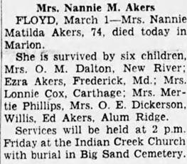 Mahala 8 yo w/f, b. Montgomery. Nancy 8 yo w/f, b. Montgomery. Edmunson 4 yo w/m, b. Montgomery. Elizabeth 1 yo w/f, b. Floyd. Bowlin, Anna 23 yo w/f, b. Floyd, cannot read or write. (aka Sarah Anna Bolling, d/o Orpha. [Bolling] 1860 Residence: Floyd Co., VA, Copper Valley PO, H855: Akers, Jas 45 yo w/m farmer, b. VA, $0/98, HOH. Sarah 43 yo w/f, b. VA, cannot read or write. Geo W. 22 yo w/m, b. VA. Jonathan 21 yo w/m, b. VA, cannot read or write. Nancy M. 17 8 yo w/f, b. VA. Edmondson 14 yo w/m, b. VA. Elizabeth 12 yo w/f, b. VA. Asa 10 yo w/m, b. VA. Brooks 6 yo w/m, b. VA. Saltess 2 yo w/m, b. VA. Rebecca 78 yo w/f, b. VA. (probably Jamess mother) 1870 Residence: Floyd Co., VA, Alum Ridge Twp, H190: Akers, James 54 yo w/m farmer, b. VA, $400/100, HOH. Sarah 53 yo w/f, b. VA, cannot write, keeping house. Asa 18 yo w/m, b. VA, cannot read or write, farm laborer. Brooks 14 yo w/m, b. VA, cannot read or write, at home. Psalter 12 yo w/m, b. VA, cannot read or write, at home. William C. 11 yo w/m, b. VA, at home. Akers, Rebecca 88 yo, no occ, b. VA. 1880 Residence: Floyd Co., VA, Alum Ridge District, H121: Akers, James 64 yo w/m farm laborer with spinal disease, b. VA, parents b. VA, HOH. Sarah 63 yo wife, b. VA, parents b. VA, keeping house. Charlton W. 19 yo son, b. VA, parents b. VA, at home. 1890 Residence: Floyd Co., VA, Indian Valley District: Akers, James 75 yo. (alone or with family of a different surname) 1891 Marriage #2: James Akers m. Nancy Lefew 08-10-1891 at Nancy Lefew's, Floyd Co., VA by Humphrey Duncan. He 76 yo widowed w/m farmer, b. Montgomery Co., VA now Floyd & living in Floyd Co., VA, s/o Jonhan & Rebeck Akers. She 60 yo single w/f, b. Franklin Co., VA & living in Floyd Co., VA, d/o Josiah & Martha Leffew. Nancy
