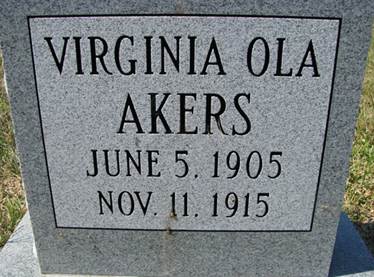Parents: Jonathan A. & Harriet E. (Lester) Akers. 1869 Birth: 11-8-1869 Floyd Co., VA. (src; FCVA birth record) 1870 Residence: Floyd Co., VA with parents. 1880 Residence: Montgomery Co., VA with parents. 1890, 1900 Residence: Floyd Co., VA with parents. 1908 Death: 6-26-1908. 1908 Burial: Fletchers Cemetery, Giles Co., VA.