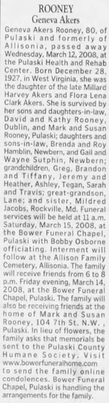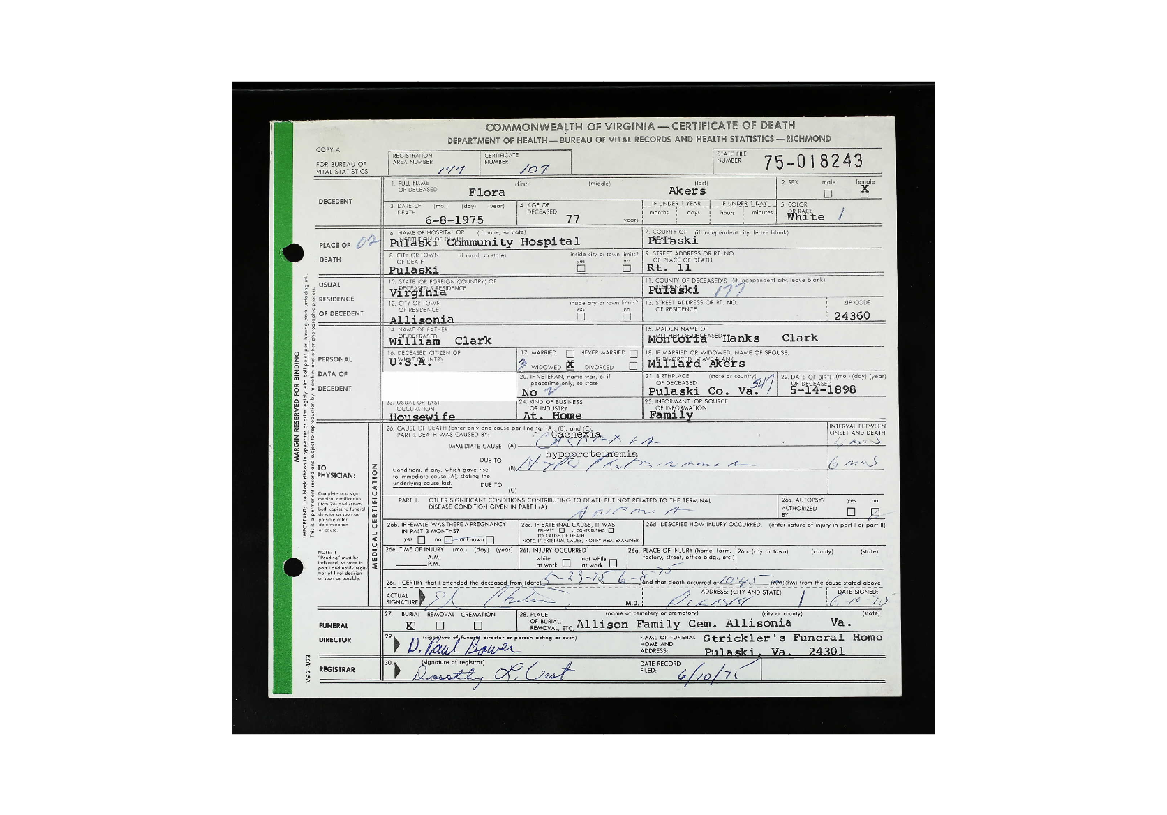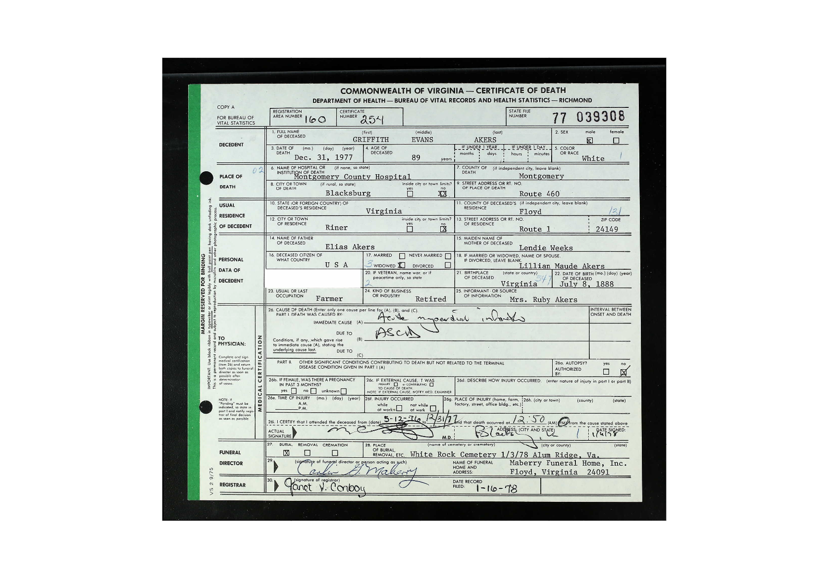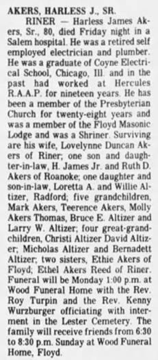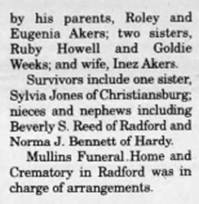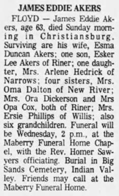 Parents: James Wallace & Arminta Alice Mintie (Flinchum) Akers. 1906 Birth: 12-6-1906 Narrows, VA. (src: delayed birth record noted to be the 5th child born to James Wallace Akers & Mintie Allice Flenchum.) 1910, 1920, 1930 Residence: Giles Co., VA with parents. Marriage #1: Ole Mae Lawson Ole Mae Lawson, 1907-2004, d/o Samuel Scott & Drucy Eliza (Lawson) Lawson. [no file] 1984 Death: 4-12-1984 Giles Memorial Hospital, Pearisburg, Giles Co., VA but of 151 Woodlawn St, Narrows, Giles Co., VA. James Blaine Akers, 77 yo married w/m textile plant laborer, b. Dec 6, 1906 VA. Spouse: Ola Lawson Akers. Father: James Wallace Akers. Mother: Mintie Flinchum. Informant: Ola Lawson Akers. COD: disseminated intravascular coagulopathy; multiple blood transfusions; ruptured aortic aneurysm; chronic renal failure; hypertension. 1984 Burial: Fairview Cemetery, Narrows, Giles Co., VA.