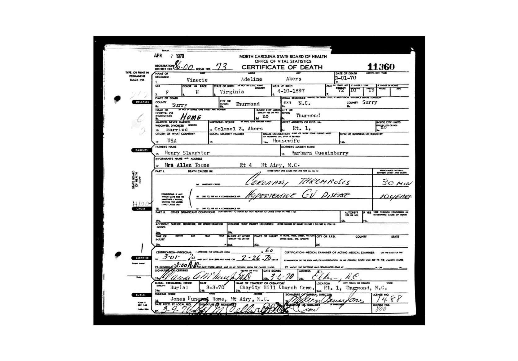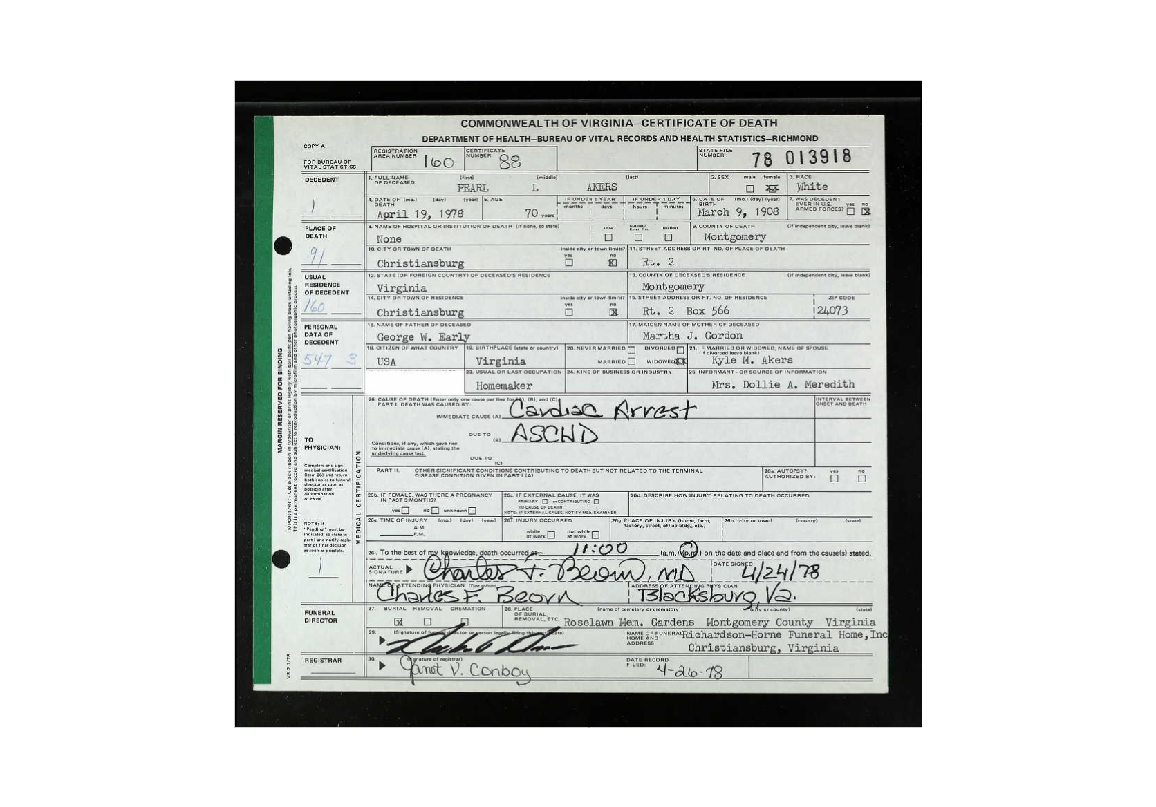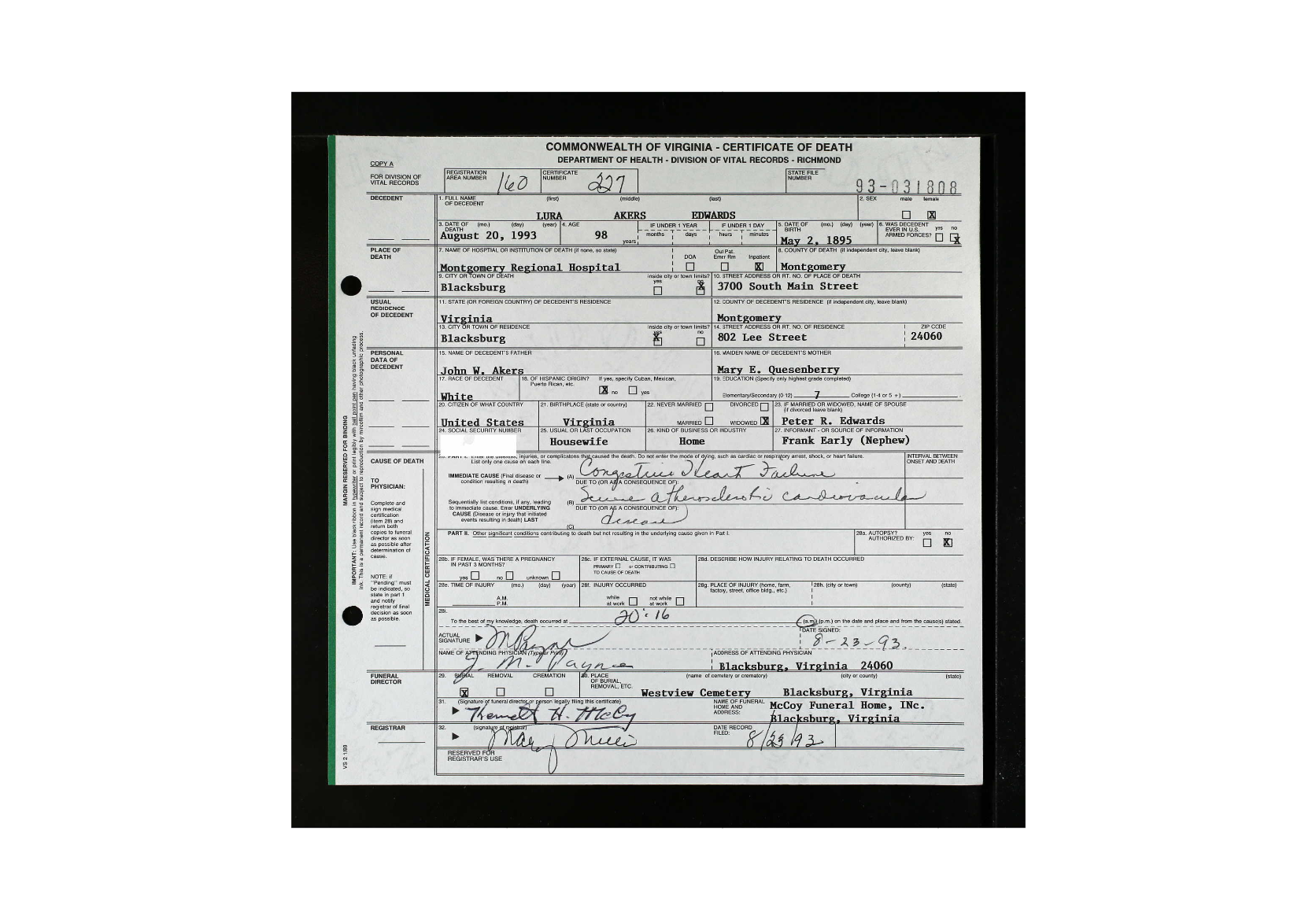 Parents: James Wallace & Arminta Alice Mintie (Flinchum) Akers. 1906 Birth: 12-6-1906 Narrows, VA. (src: delayed birth record noted to be the 5th child born to James Wallace Akers & Mintie Allice Flenchum.) 1910, 1920, 1930 Residence: Giles Co., VA with parents. Marriage #1: Ole Mae Lawson Ole Mae Lawson, 1907-2004, d/o Samuel Scott & Drucy Eliza (Lawson) Lawson. [no file] 1984 Death: 4-12-1984 Giles Memorial Hospital, Pearisburg, Giles Co., VA but of 151 Woodlawn St, Narrows, Giles Co., VA. James Blaine Akers, 77 yo married w/m textile plant laborer, b. Dec 6, 1906 VA. Spouse: Ola Lawson Akers. Father: James Wallace Akers. Mother: Mintie Flinchum. Informant: Ola Lawson Akers. COD: disseminated intravascular coagulopathy; multiple blood transfusions; ruptured aortic aneurysm; chronic renal failure; hypertension. 1984 Burial: Fairview Cemetery, Narrows, Giles Co., VA.