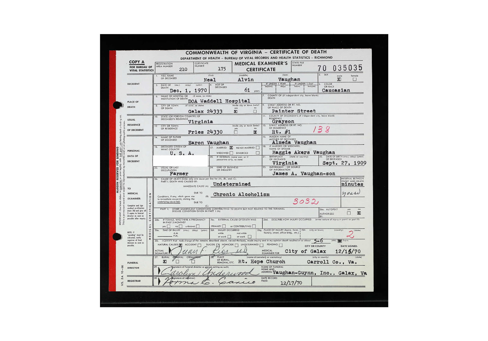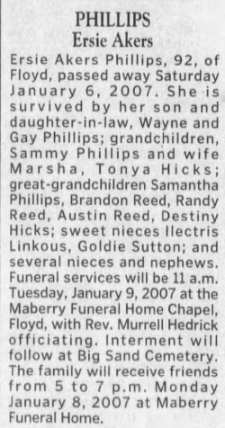 p.m. Tuesday at the Maberry Funeral Home. Roanoke Times, The (VA) - Tuesday, January 30, 1996 1996 Burial: Alley Cemetery, SR 814, Alum Ridge, Floyd Co., VA. (no photo as of Mar 2026) |
