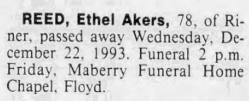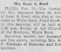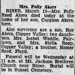 Parents: Spencer Abram & Laura B. (Duncan) Reed. [Reed_Spencer_Margaret] 1904 Birth: 10-7-1904 Floyd Co., VA. 1930 Residence: McClean Co., IL with husband Mason M. Akers. 1940 Residence: Henrico Co., VA with husband Mason M. Akers. 2001 Death: 1-15-2001 Richmond, Chesterfield Co., VA.