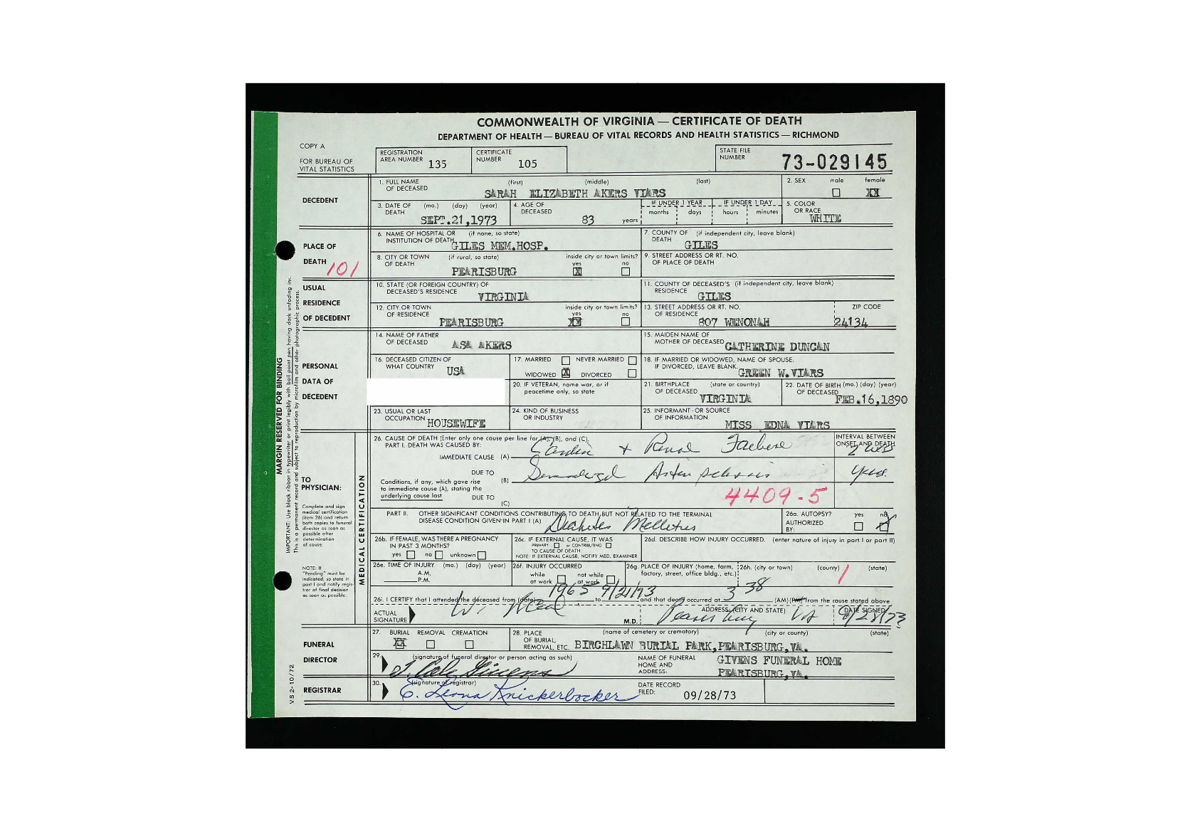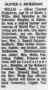 The Roanoke Times, Roanoke, Virginia · Saturday, October 20, 1973 1973 Burial: Hickman Cemetery, Radford City, VA.