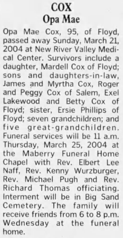 Parents: Lawyer Braxton & Violet Louisa (Phillips) Cox. [Cox_Braxton_Nancy] 1895 Birth: 11-12-1895 Floyd Co., VA. 1975 Death: