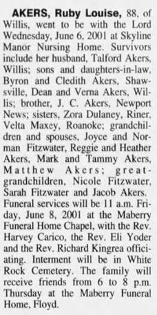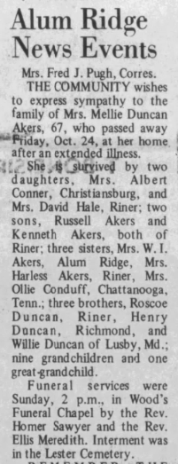 Parents: William Austin & Martha Sabrina (Wade) Duncan. [Duncan_BlanchJr_2wives] 1898 Birth: 7-21-1898 VA. 1930 Residence: Radford City, VA with husband Woodie Isaac Akers. 1940 Residence: Floyd Co., VA with husband Woodie Isaac Akers. 1996 Death: 1-28-1996 of Willis, Floyd Co., VA. AKERS, Toye Duncan, 97, of
