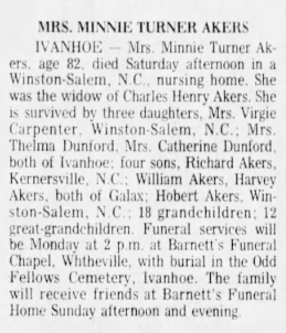 Parents: Robert W. & Rachel M. (unknown) Flinchum. [no file] 1870 Death: 10-28-1870 Floyd Co., VA. (src: death record; tombstone) 1871 Birth: 10-1871 VA. (src: 1900 census) 1900, 1910, 1920, 1930 Residence: Giles Co., VA with husband James Wallace Akers 1945 Death: 8-30-1945 Narrows, Pearisburg District, Giles Co., VA. Mintie Alice Akers, 74y 10m 1d, widowed w/f, b. Oct 28, 1870 Floyd Co., VA. Spouse: James Wallace Akers. Father: William Flinchum, b. Floyd Co., VA. Mother: not known. Informant: Mrs. F. L. Fanning of Silver Springs Maryland. COD: uremia. Burial: Fairview Cem., Narrows, VA, Aug 31, 1945. 1945 Burial: Fairview Cemetery, Narrows, Giles Co., VA. |