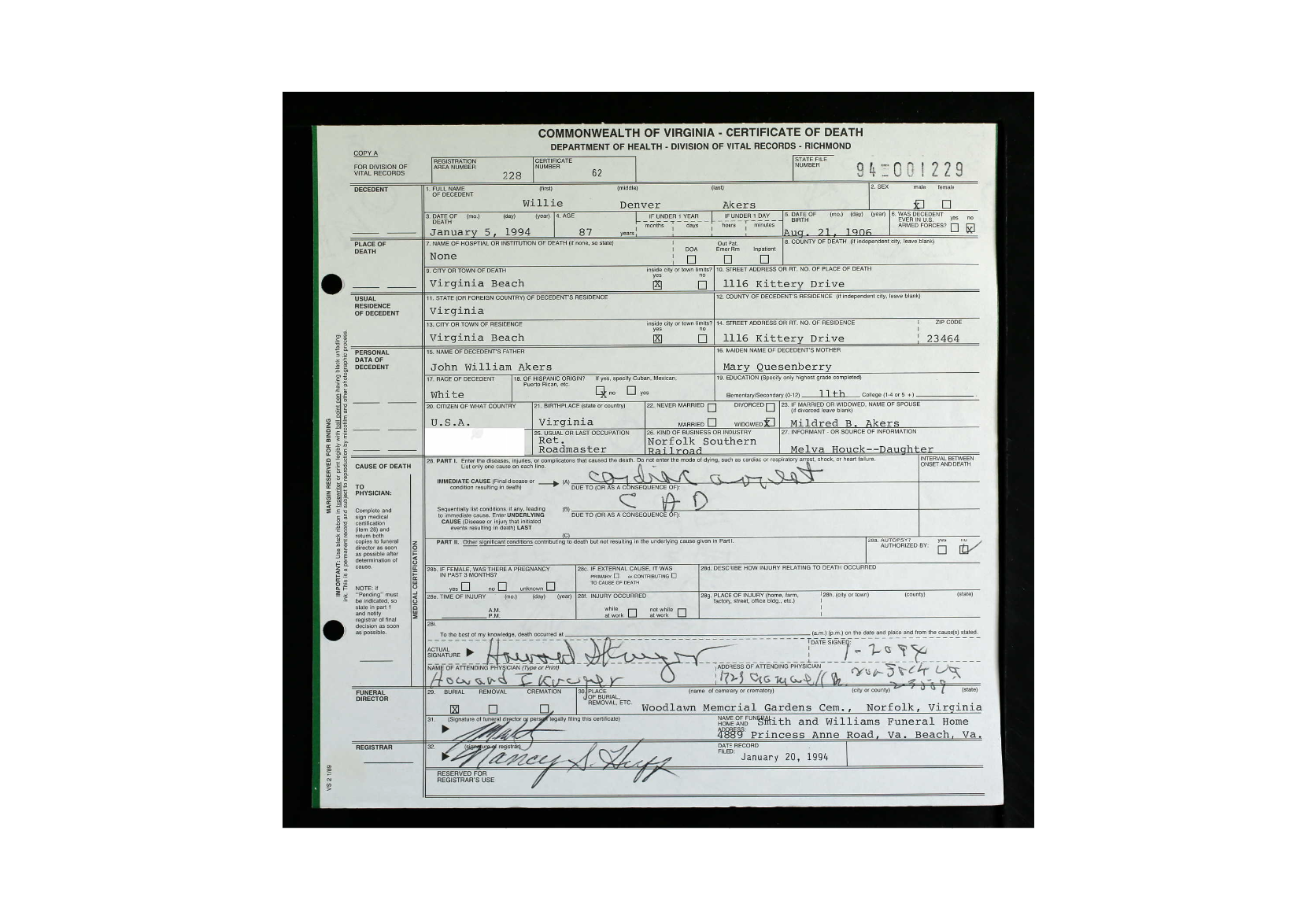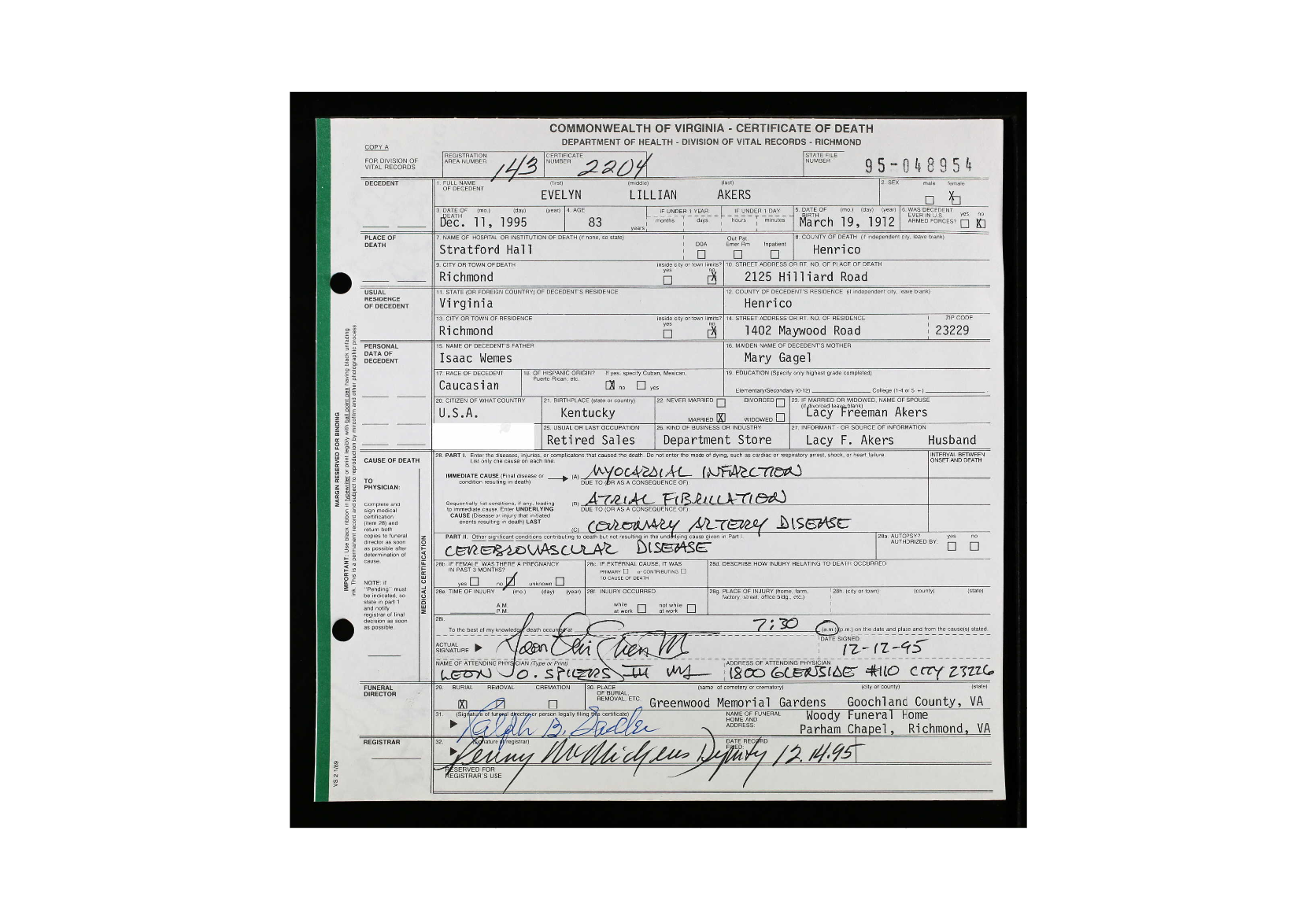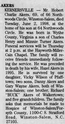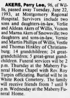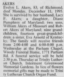 Parents: Mason McKinley Pop & Delia Sarah Rachel (Reed) Akers. 1925 Birth: 5-16-1925 VA. 1930 Residence: McClean Co., IL with parents. 1940 Residence: Henrico Co., VA with parents. Marriage #1: Doris Mae Wilson nee Huckabee, d/o Clyde & Lottie (Timberlake) Huckabee. She was 1st m. & div. from Johnnie L. Wilson. 2016 Death: 2-8-2016 of Henrico, VA.