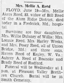 Parents: Humphrey R. & 1st wife Lucy A. (Mannon) Reed. [Reed_HumphreyE_Nancy] 1887 Birth: 3-3-1883 Floyd Co., VA. 1930, 1940 Residence: Hancock Co., IL with husband Fuller Roscoe Akers. |