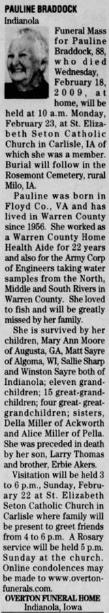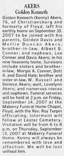 sister, Lovell Akers, Riner. Funeral services will be 2 p.m. Wednesday at the