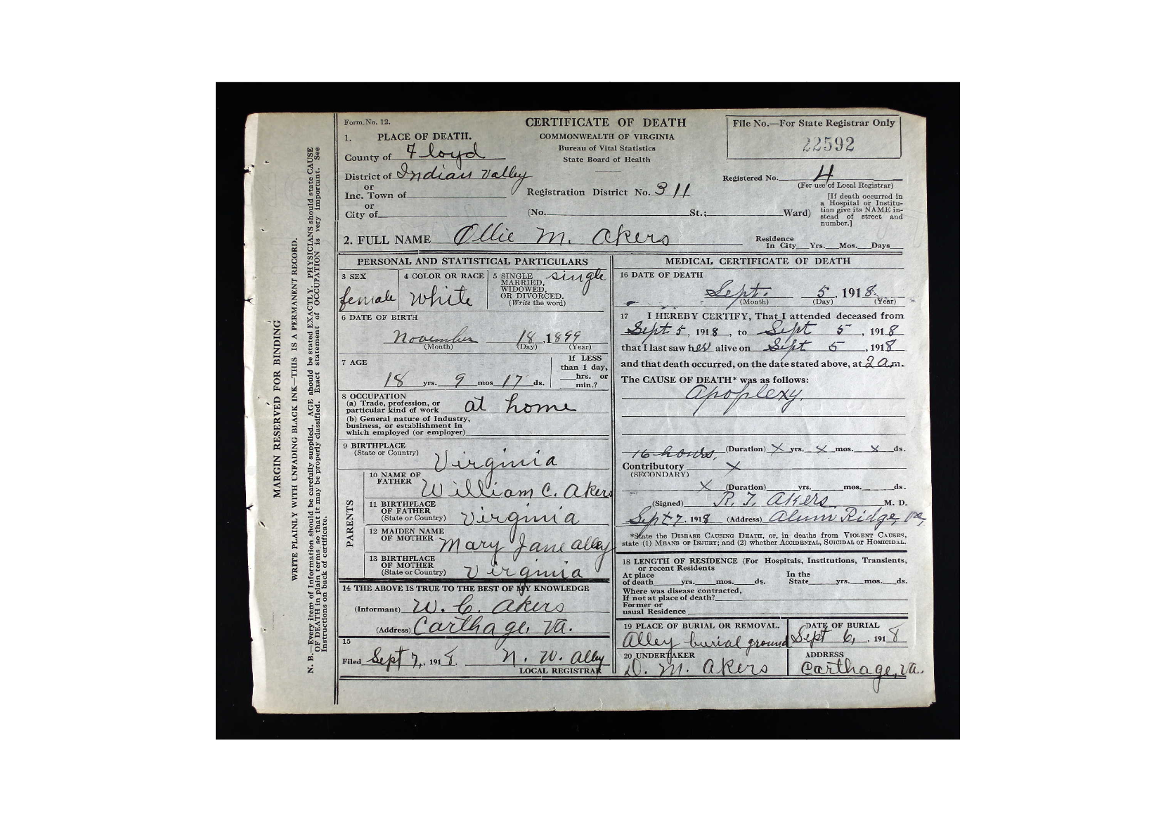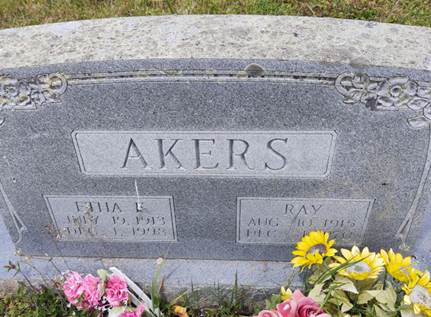 Parents: William Charlton & Mary Jane (Alley) Akers. 1899 Birth: 11-18-1899 VA. 1900, 1910 Residence: Floyd Co., VA with parents. 1918 Death: 9-5-1918 Indian Valley District, Floyd Co., VA. [Death Cert] 1918 Burial: Alley Cemetery, 413 Dulaney Rd NW, Floyd Co., VA. (no photo as of Mar 2026) |