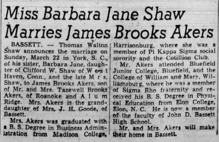 Parents: William Charlton & Mary Jane (Alley) Akers. 1907 Birth: 10-5-1907 Carthage, Floyd Co., VA. 1910, 1920 Residence: Floyd Co., VA