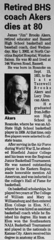 Parents: Mason McKinley Pop & Delia Sarah Rachel (Reed) Akers. 1922 Birth: 12-6-1922 Belsprings, VA. 1930 Residence: McClean Co., IL with parents. 1940 Residence: Henrico Co., VA with parents. 1947 Marriage #1: Joyce Marie Humphrey 1947 Richmond, VA. Joyce Marie Humphrey, b. Richmond, d/o Samuel G. Cleveland & 2nd wife Thelma Garnett (Saunders) Humphrey. 1982 Death: 8-11-1982 Richmond, VA. [Death Cert]
