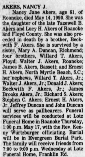 Parents: Woody Isaac & Toye Nettie (Duncan) Akers. 1934 Birth: 1934. 1934 Death: 1934. 1934 Burial: Alley Cemetery, 413 Dulaney Rd NW, Floyd Co., VA. (no photo as of Mar 2026) |