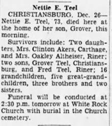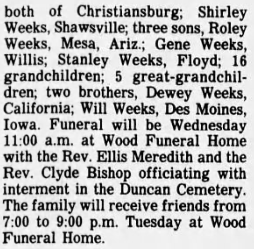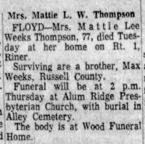 The Roanoke Times, Roanoke, Virginia · Thursday, February 25, 1965 1965 Burial of Mattie Weeks Thompson: Alley Cemetery, Alum Ridge, Floyd Co., VA. (no photo as of Mar 2026) |
