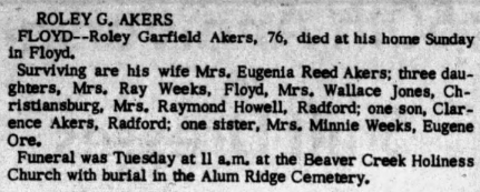 Parents: William Charlton & Mary Jane (Alley) Akers. 1895 Birth: 3-29-1895 Floyd Co., VA. 1900, 1910 Residence: Floyd Co., VA with parents. 1917 Registration Card: Roy Arville Akers, 22 yo single w/m of Carthage, VA, b. Mar 29, 1895 Floyd Co., VA, farmer, his mark witnessed, medium height & build, blue eyes & black hair. 1920 Floyd Co., VA, Indian Valley District, H29: 1921 Marriage #1: Roy A. Akers m. Sadie M. Cox 4-28-1921 Indian Valley, Floyd Co., VA by J. M. Phillips, Minister of the Primitive Baptist Church. He 26 yo single w/m farmer, b. & living in Floyd Co., VA, s/o William & Mary J. Akers. She 23 single w/f, b. & living in Floyd Co., VA d/o L. B. & Louise V. Cox. 1930: 1940 Residence: