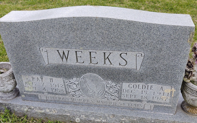 d/o George Weeks & Demaris Thompson. Abraham Wade Thompson, s/o Lloyd L. & Nancy Mahala (Akers) Thompson. [Thompson_Loyd_Nancy] 1965 Death of Mattie Weeks Thompson: 2-23-1965 Rt 1, Riner, Floyd Co., VA. [Death Cert] Mattie Weeks Thompson, 76 yo widowed w/f, b. Apr 27, 1888 Floyd Co., VA. Spouse: Abraham Thompson. Father: George Weeks. Mother: unknown Thompson. Informant: Mrs. Joe Stegall. COD: congestive heart failure; myocarditis. Burial: Alley Cemetery, Alum Ridge, VA.
