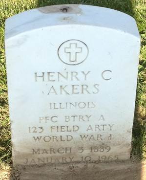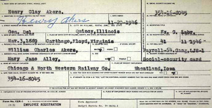 Parents: William Charlton & Mary Jane (Alley) Akers. 1889 Birth: 3-3-1889 Floyd Co., VA. 1890, 1900 Residence: Floyd Co., VA with parents. 1910: two possibilities, both in Hancock Co., IL. Probably same person as he is a hired hand in both records. 1917 Registration Card: Henry Clay Akers, 28 yo single w/m of R.R. 5 Monmouth, IL, b. Mar 3, 1889 Floyd Co., VA, farm laborer, medium height & build, blue eyes & brown hair. 1946 Railroad Card: