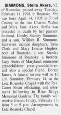 Parents: William Charlton & Mary Jane (Alley) Akers. 1905 Birth: 4-14-1905 Floyd Co., VA. 1910, 1920 Residence: Floyd Co., VA with parents. 1922 Marriage #1: Stella Gladys Akers m. S.C. Simmons 12-20-1922 Alum Ridge, Floyd Co., VA by R. T. Akers, Minister of the Church of the Brethren. He 24 yo single w/m farmer, b. Floyd Co., VA, residence Sowers, VA, s/o R. H. & Sarah Simmons. She 17 yo single w/f, b. Floyd Co., VA, residence Alum Ridge, VA, d/o W. C. & Mary J. Akers. Stanley Crosby Simmons, 1895-1974, s/o Hosea Rufus & Sarah Frances Rebecca (Thompson) Simmons. [Death Cert] [Simmons_JamesW_4wives]