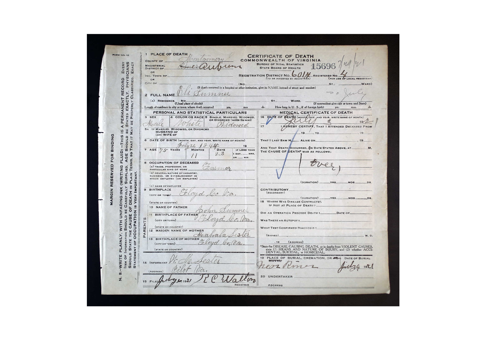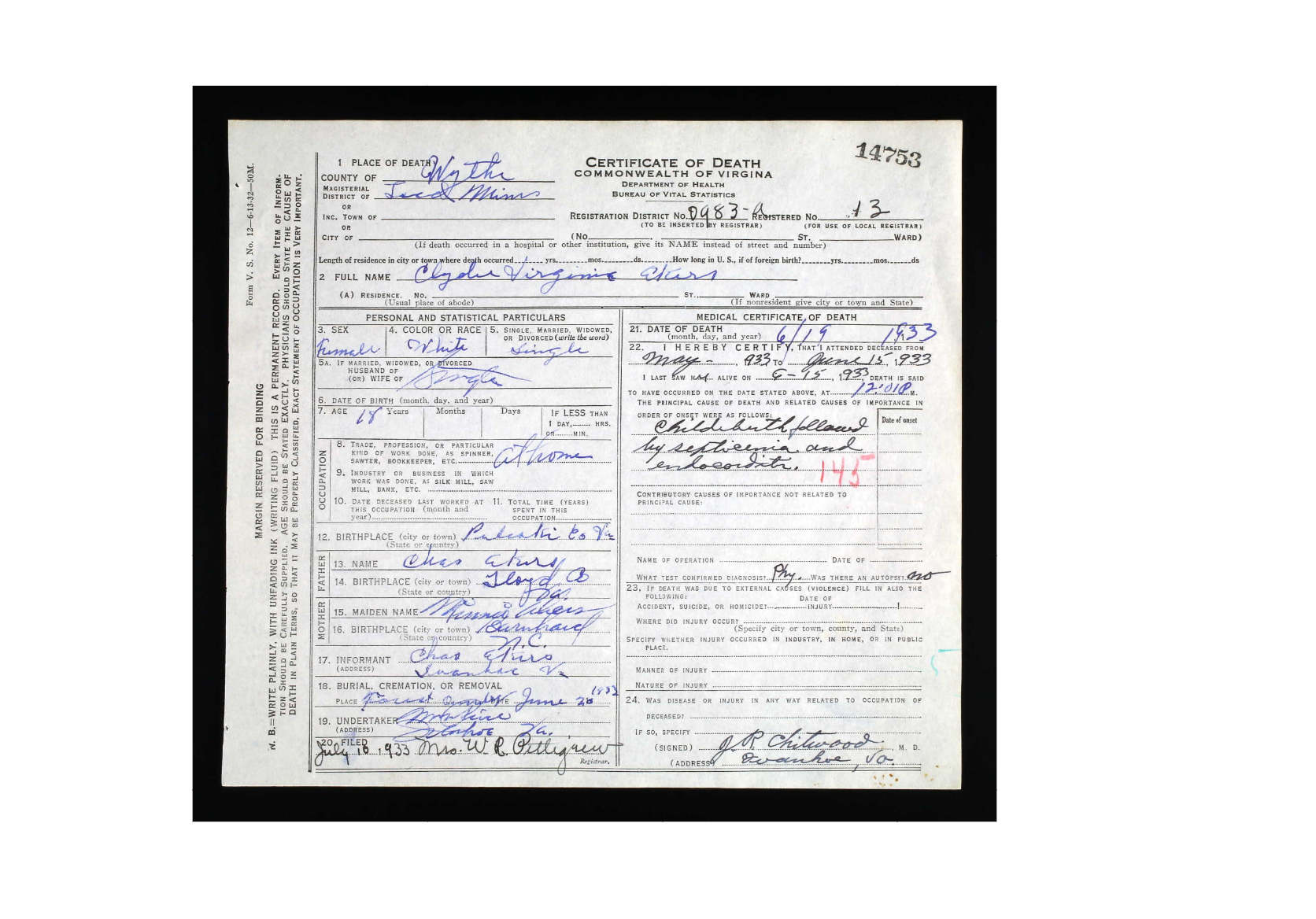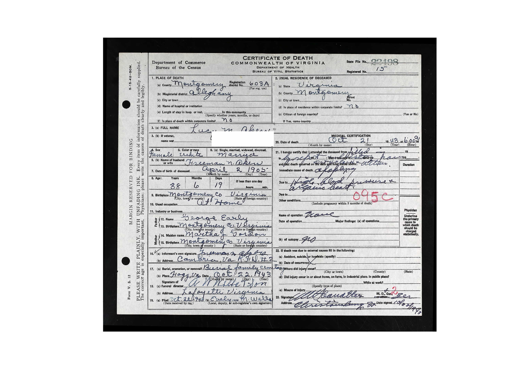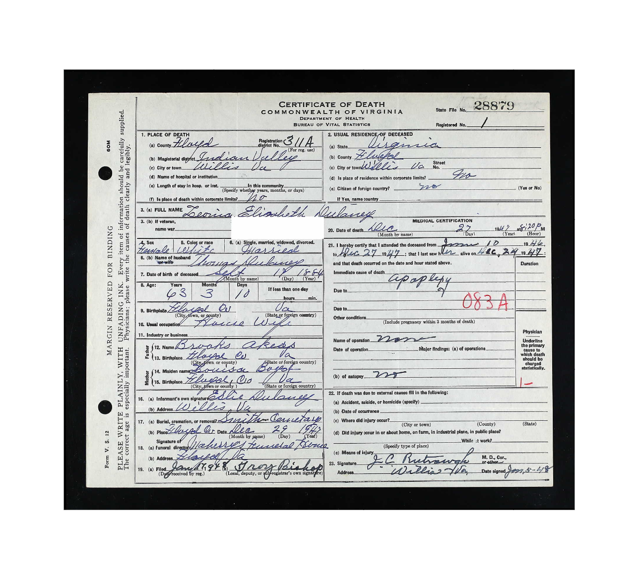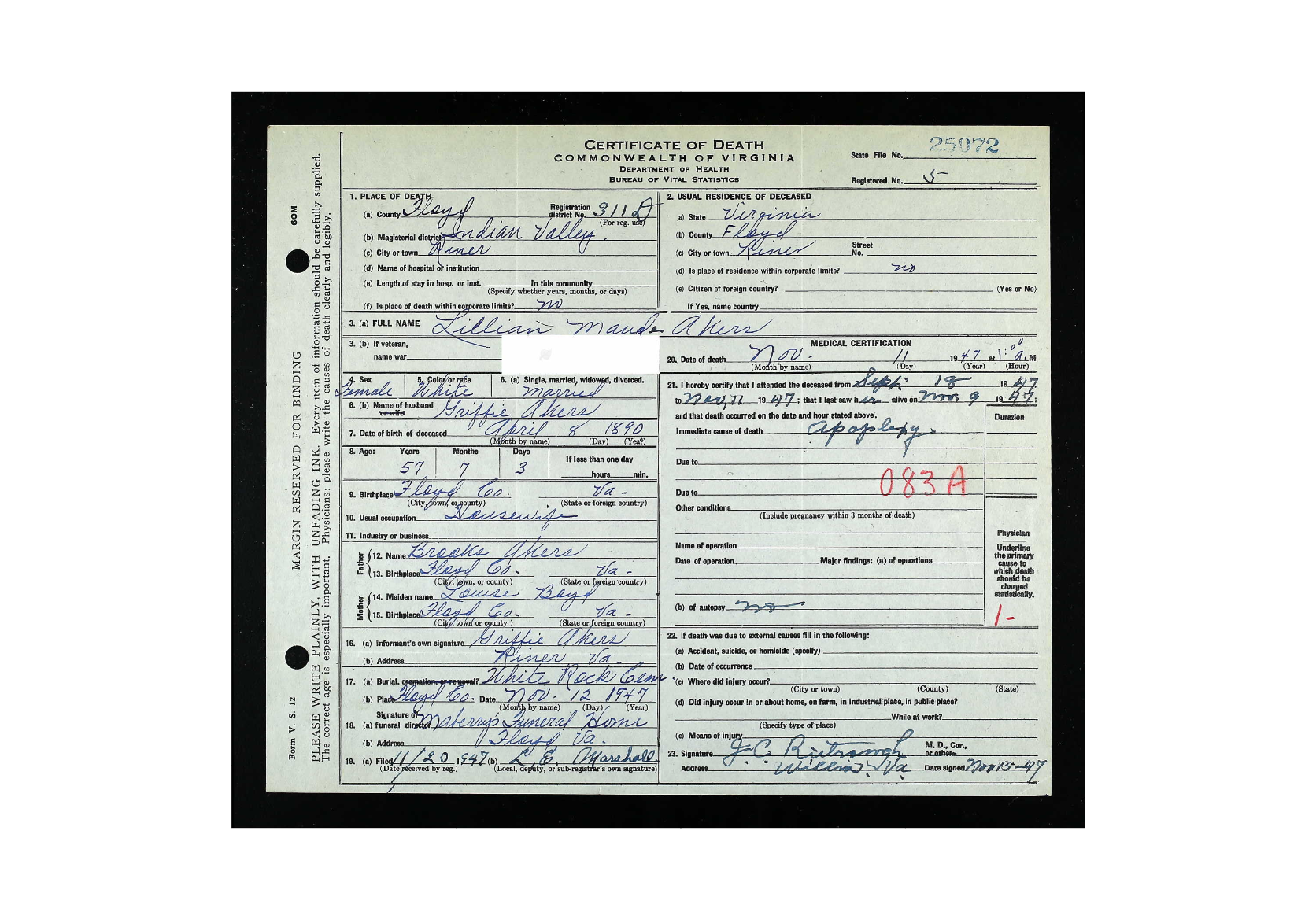 Community Hospital, Radford. VA but of Alum Ridge, Floyd Co., VA. [Death Cert] Sadie