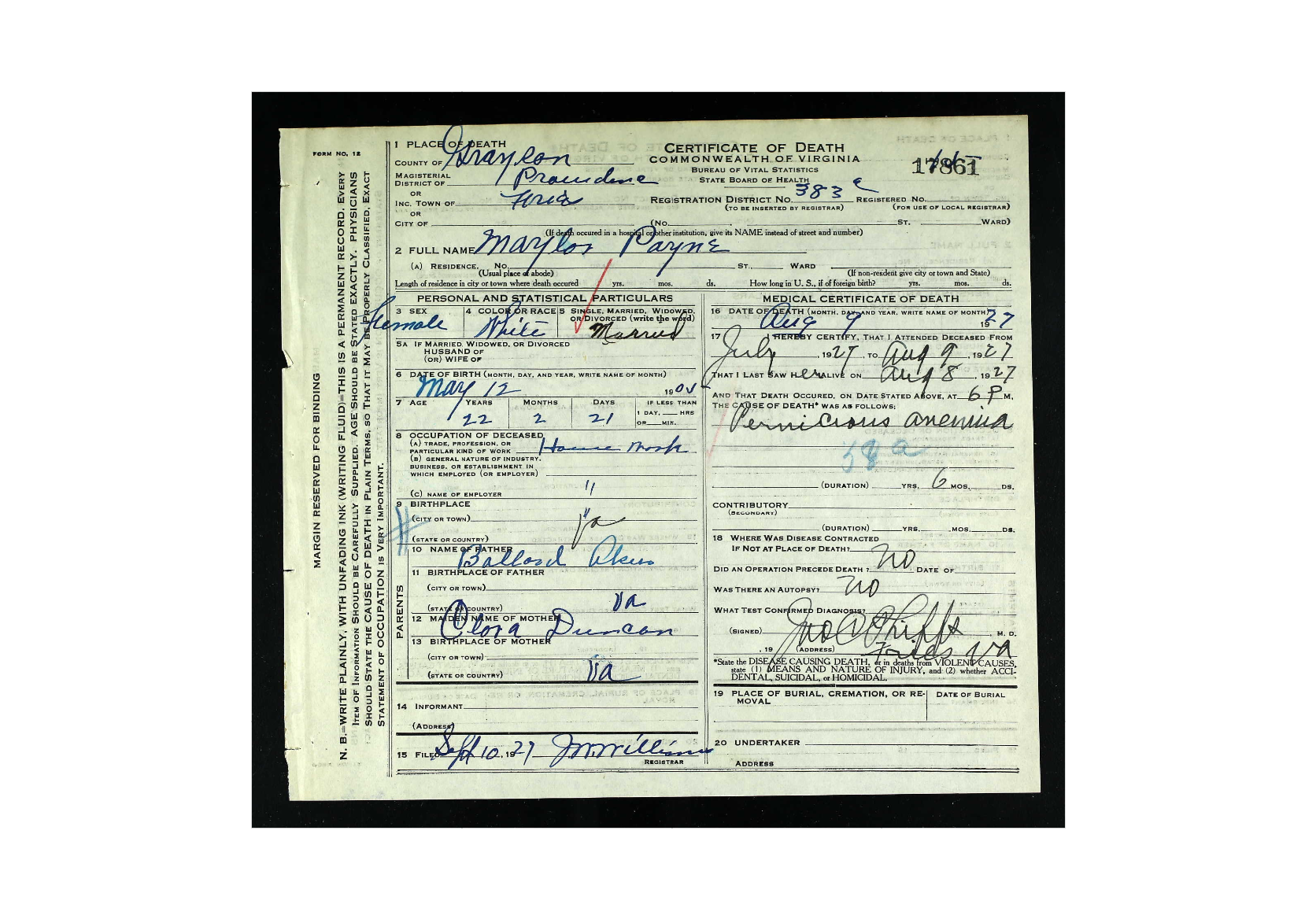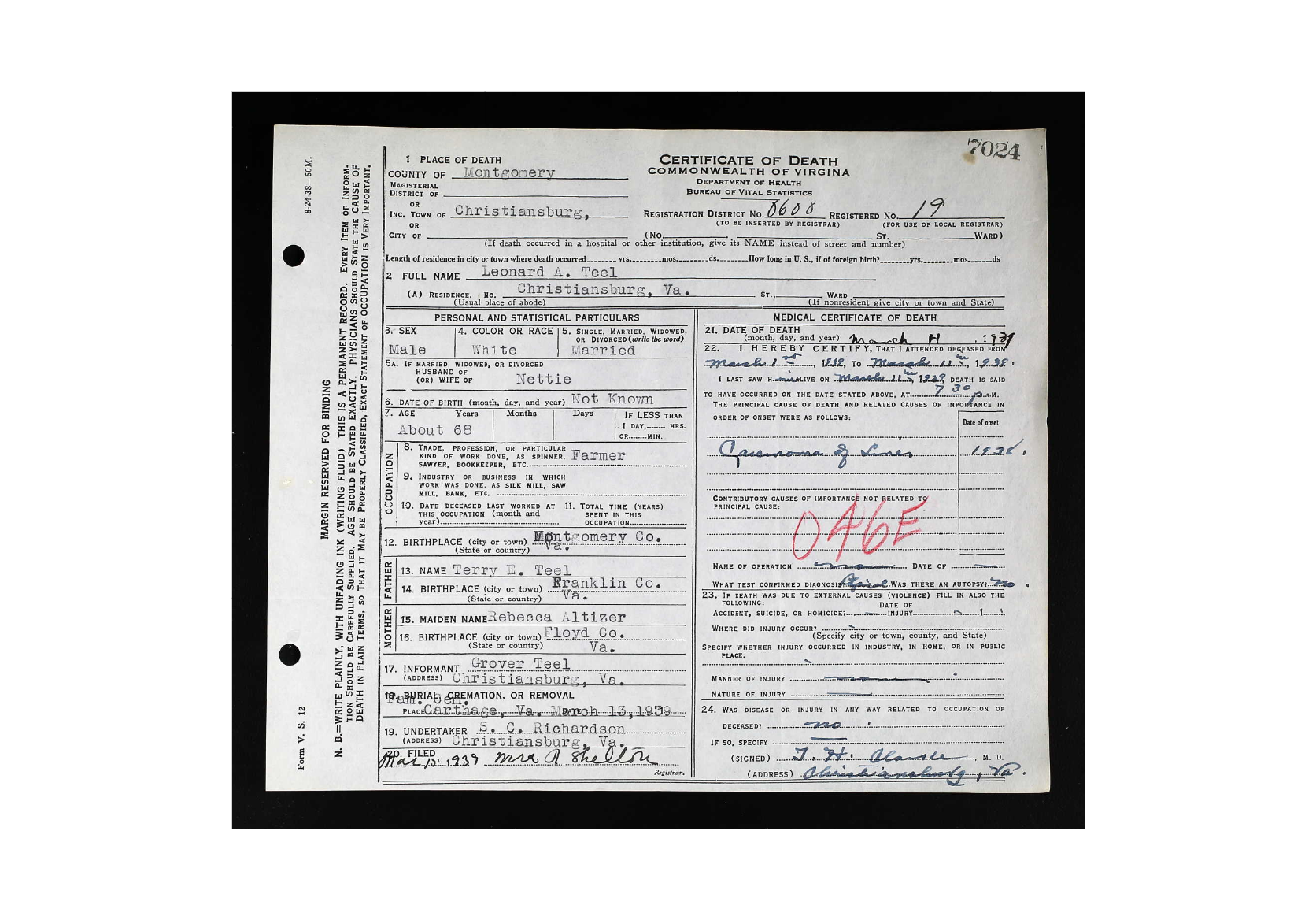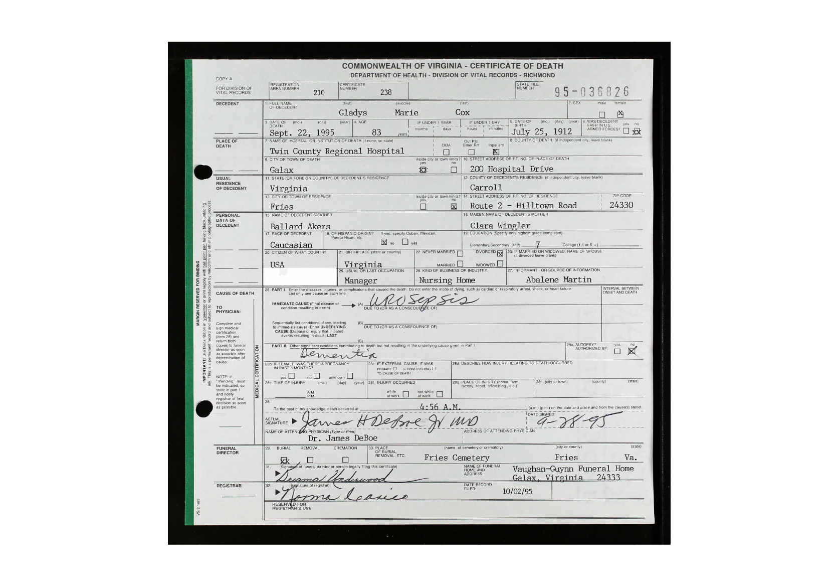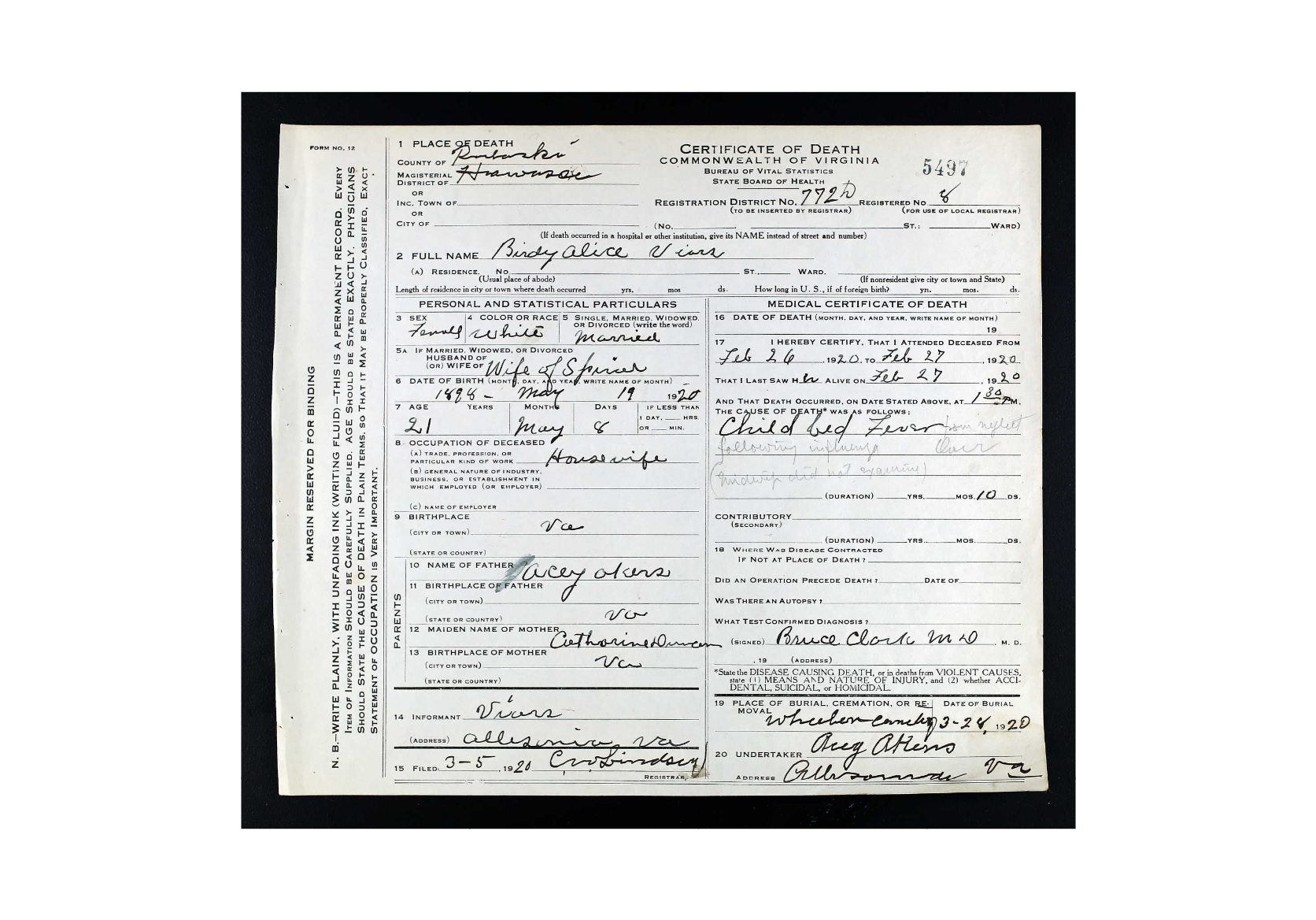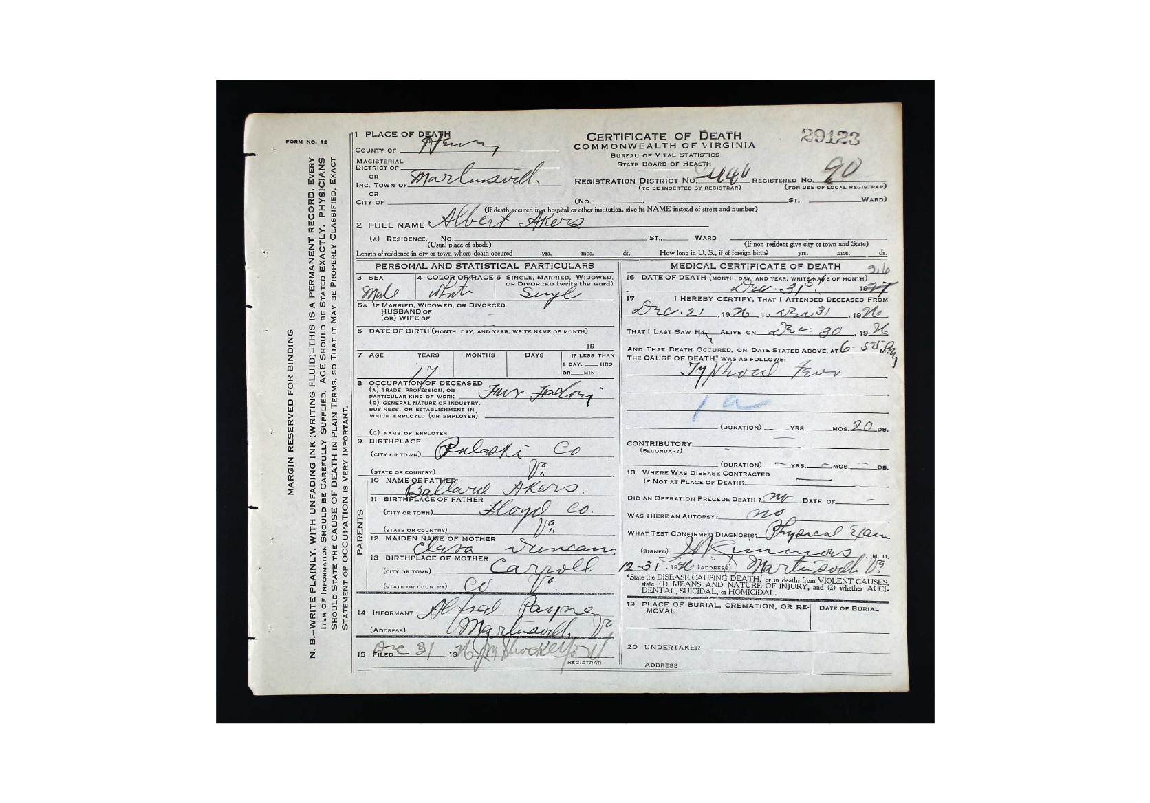 Community Hospital, Radford. VA but of Alum Ridge, Floyd Co., VA. [Death Cert] Sadie