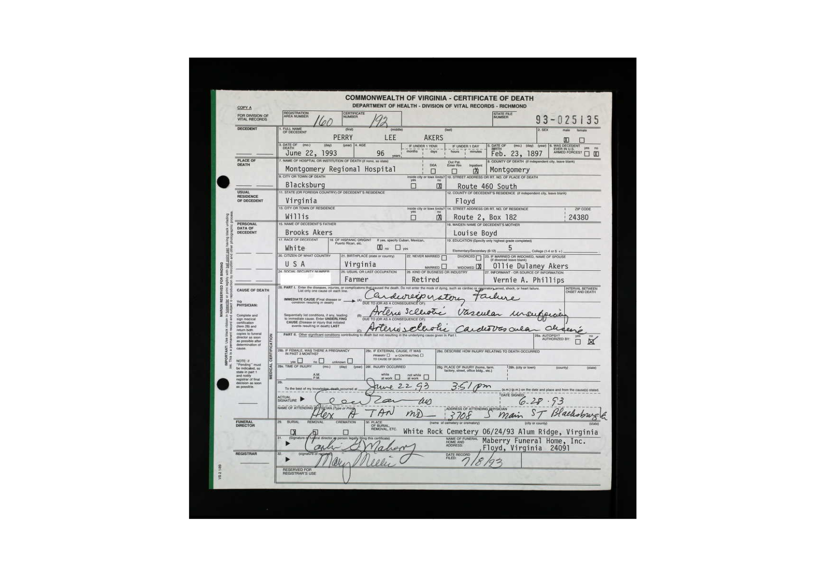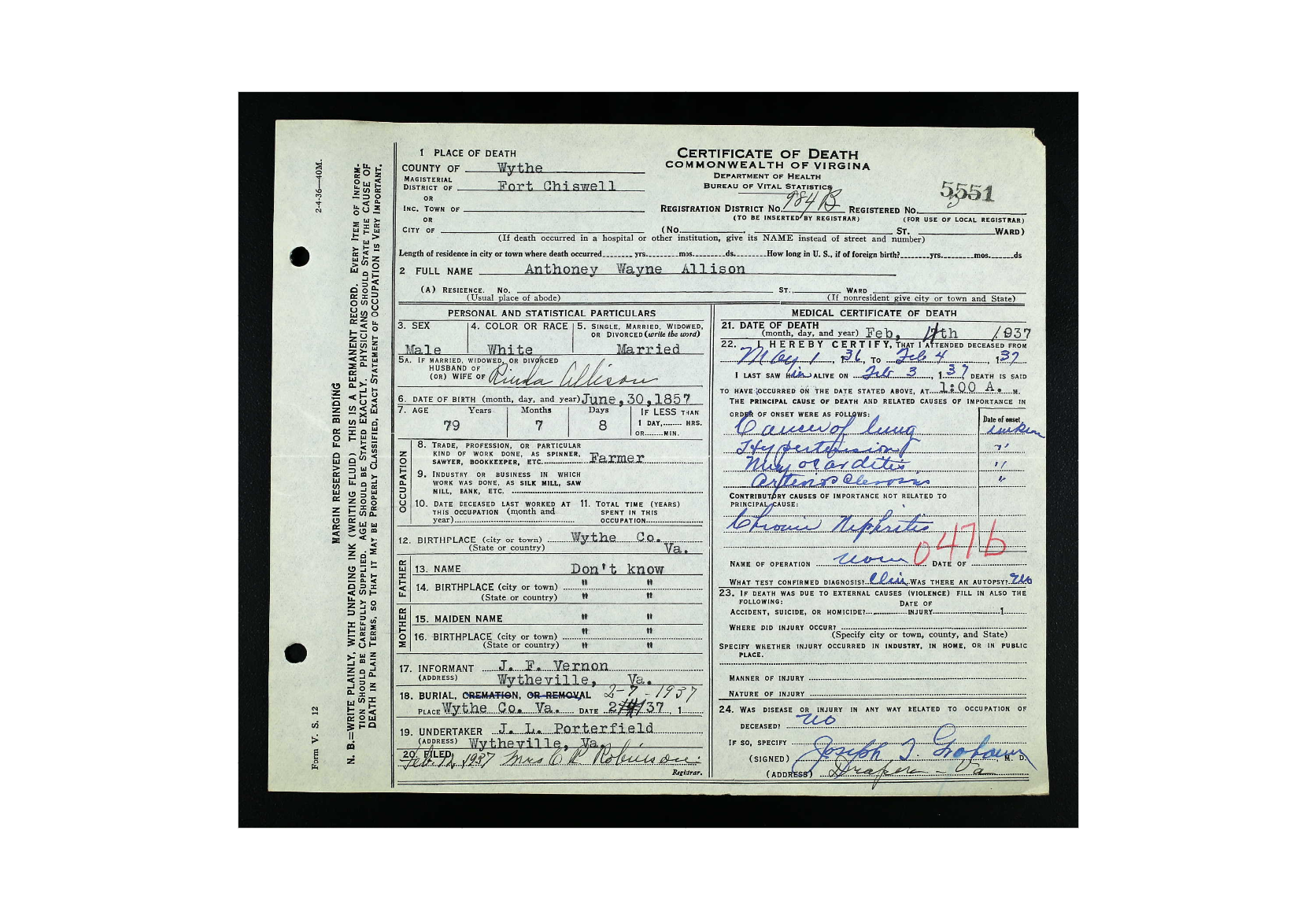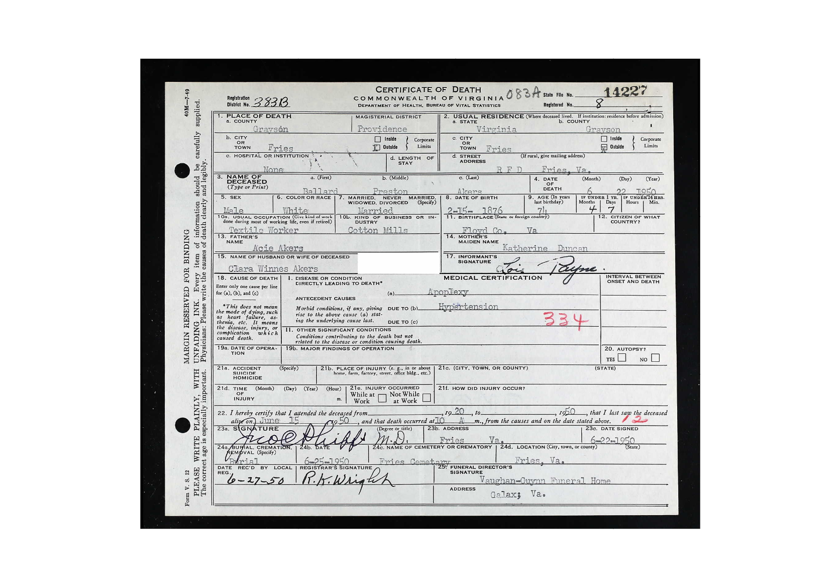 living. (does read Mary A.) Stella V. 9 yo daughter, b. Apr 1891 VA, parents b. VA, school. Maude V. 6 yo daughter, b. Feb 1894 VA, parents b. VA. James F. 2 yo son, b. Oct 1897 VA, parents b. VA. 1910 Residence: Giles Co., VA, Pearisburg District 21, H197: Akers, Wallace 41 yo w/m farmer, b. VA, parents b. VA, M1 20y, rents farm, HOH. (he can read & write) Minta A. 38 yo wife, b. VA, parents b. NC, M1 20y, 6 children with 6 living. Stella V. 19 yo single daughter, b. VA, parents b. VA. Maude V. 15 yo daughter, b. VA, parents b. VA. J. Fred 11 yo son, b. VA, parents b. VA, school. Claude 8 yo son, b. VA, parents b. VA, school. Jim 3 yo son, b. VA, parents b. VA. None 3/12 son, b. VA, parents b. VA. (i.e. not named?) 1920 Residence: Giles Co., VA, Pearisburg District 31, H113: Akers, J. Wallace 52 yo married w/m farmer, b. VA, parents b. VA, cannot read or write, owns, HOH. Mintie Alice 48 yo wife, b. VA, parents b. NC. William C. 19 yo single son, b. VA, parents b. VA. James B. 13 yo son, b. VA, parents b. VA, school. Posie M. 9 yo son, b. VA, parents b. VA, school. 1930 Residence: Giles Co., VA, Pearisburg District 6, H395: Akers, Wallace 64 yo w/m farmer, b. VA, parents b. VA, 22 yo when married, cannot read or write, HOH. Arminta A. 58 yo wife, b. Oct 1971 VA, parents b. NC, 19 yo when married. James B. 23 yo single son, b. VA, parents b. VA, farm laborer. Posie M. 20 yo son, b. VA, parents b. VA, farm laborer. 1940 Residence: Giles Co., VA, Pearisburg District 36-6, H222: Akers, James 72 yo w/m farmer, b. VA, completed G1, resided in same house 1935, owns, HOH. Mintie 69 yo wife, b. VA, completed G2, resided in same house 1935, housework. Posy 19 yo single son, b. VA, completed G4, resided in same house 1935, farm laborer. 1943 Death: 12-5-1943 rural Narrows, Pearisburg District, Giles Co., VA. James Wallace Akers, 76y 1m 18d married w/m farmer, b. Oct 17, 1866 Floyd Co., VA. Veteran: blank. Spouse: Mrs. J. A. Akers. Father: Mr. O. W. Akers, b. Floyd Co., VA. Mother: Harriet Lester, b. Franklin Co., VA. Informant: Mrs. Tom Ratliff of Narrows, VA. COD: carcinoma of prostrate 2 ½ years. Other: castration July 1942. Burial: Fairview Cem., Narrows, VA, Dec 7, 1943. 1943 Burial: Fairview Cemetery, Narrows, Giles Co., VA.