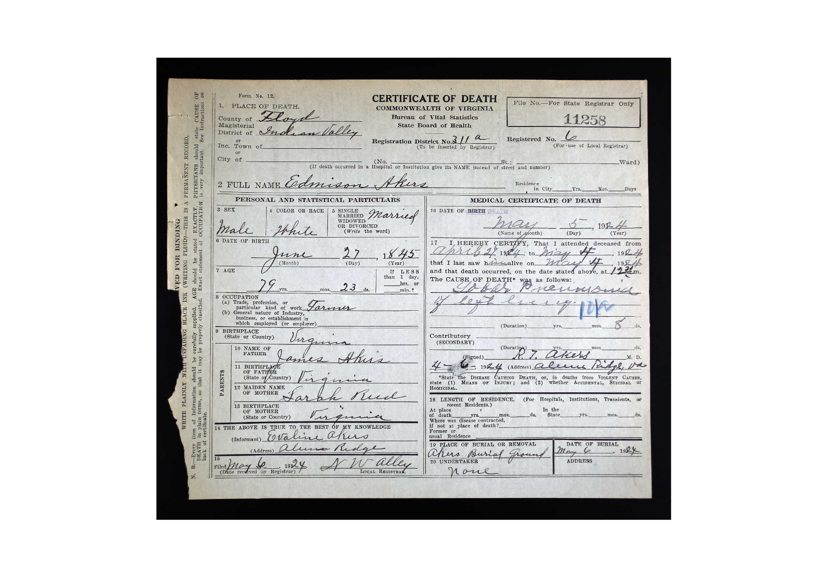 COD: CVA. Burial: White Rock Cemetery, Alum Ridge, Floyd Co., VA.