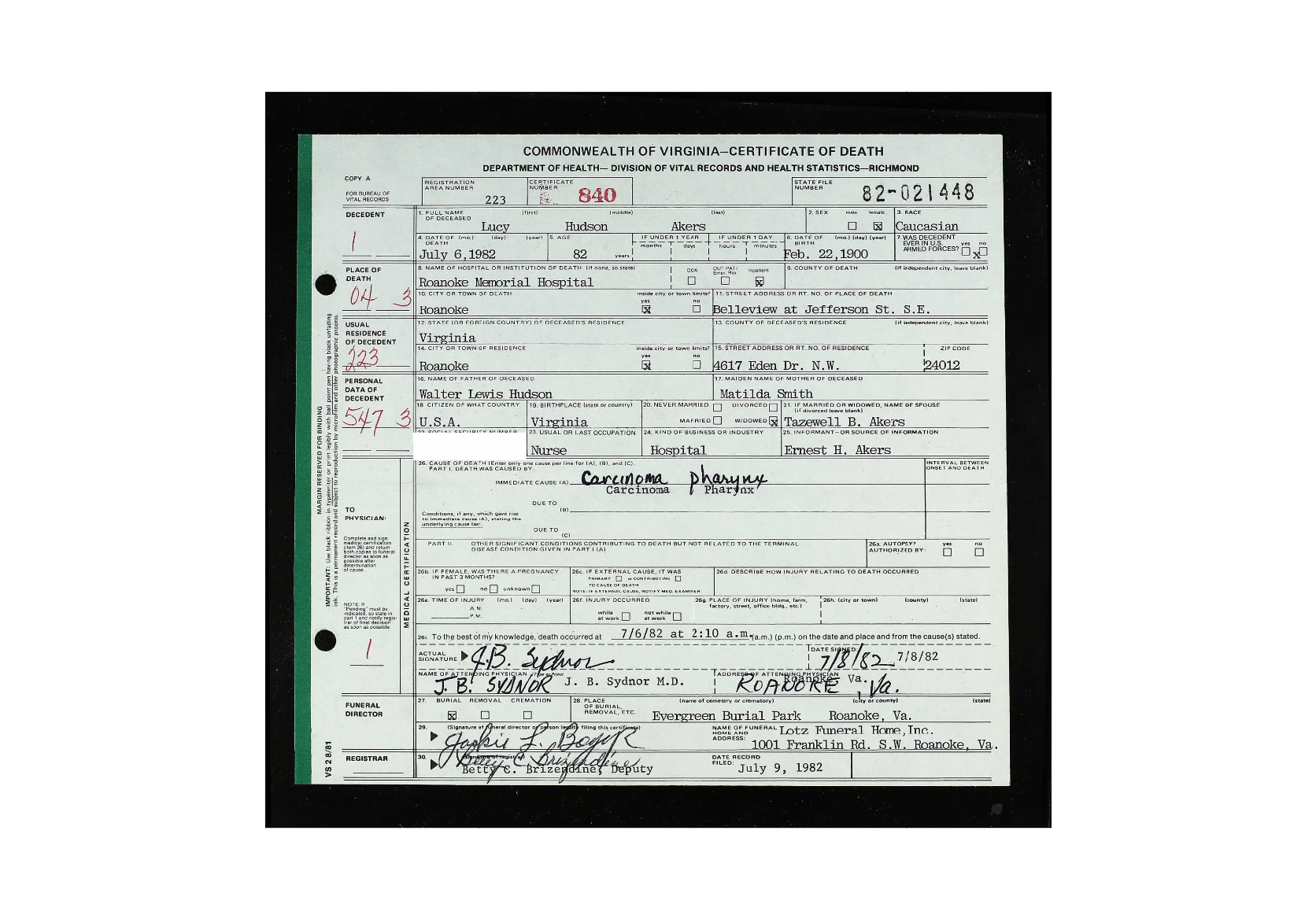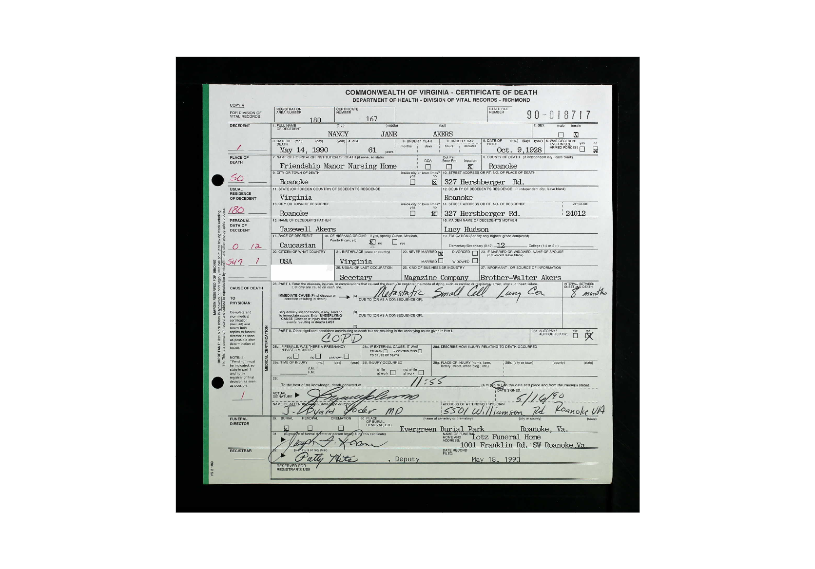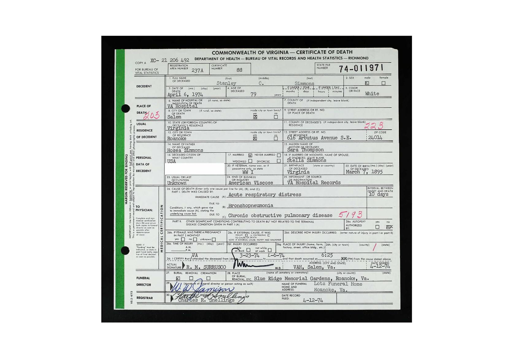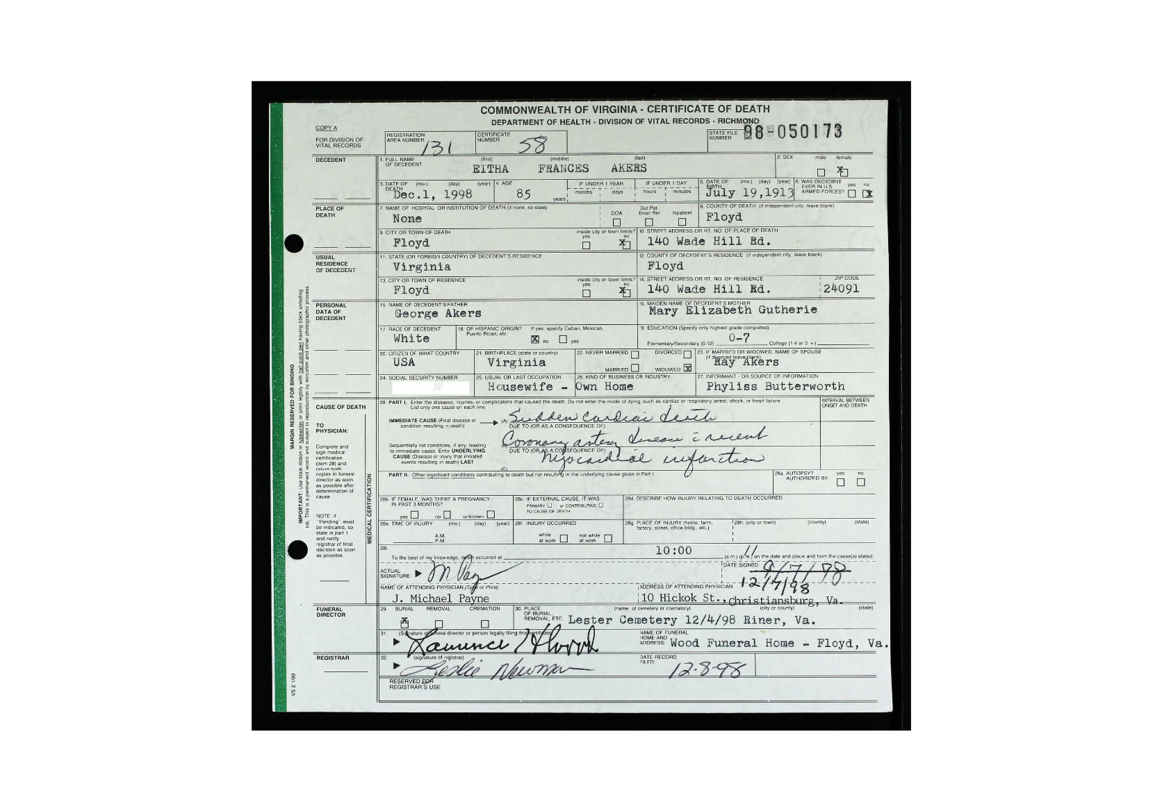 Virginia · Monday, April 08, 1974 1998 Death: 2-11-1998 Roanoke, VA. [Death Cert]