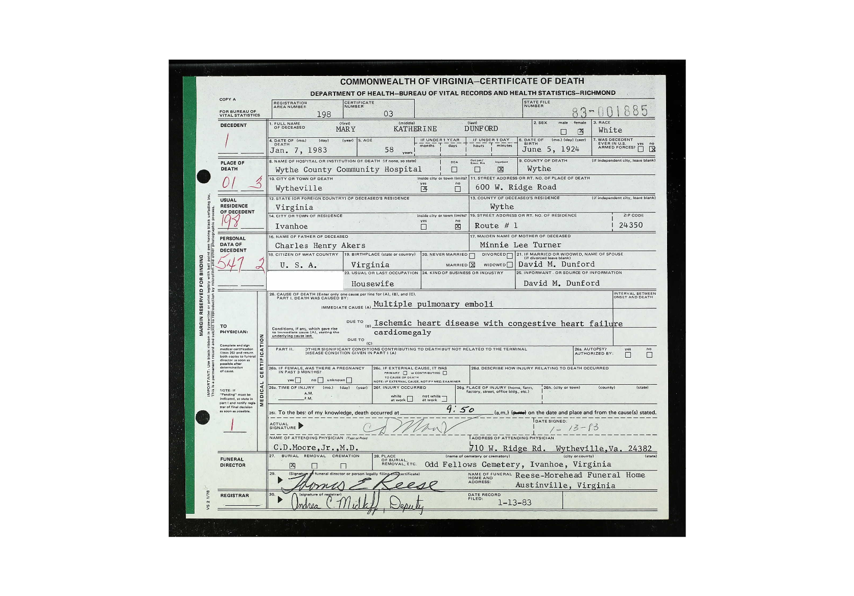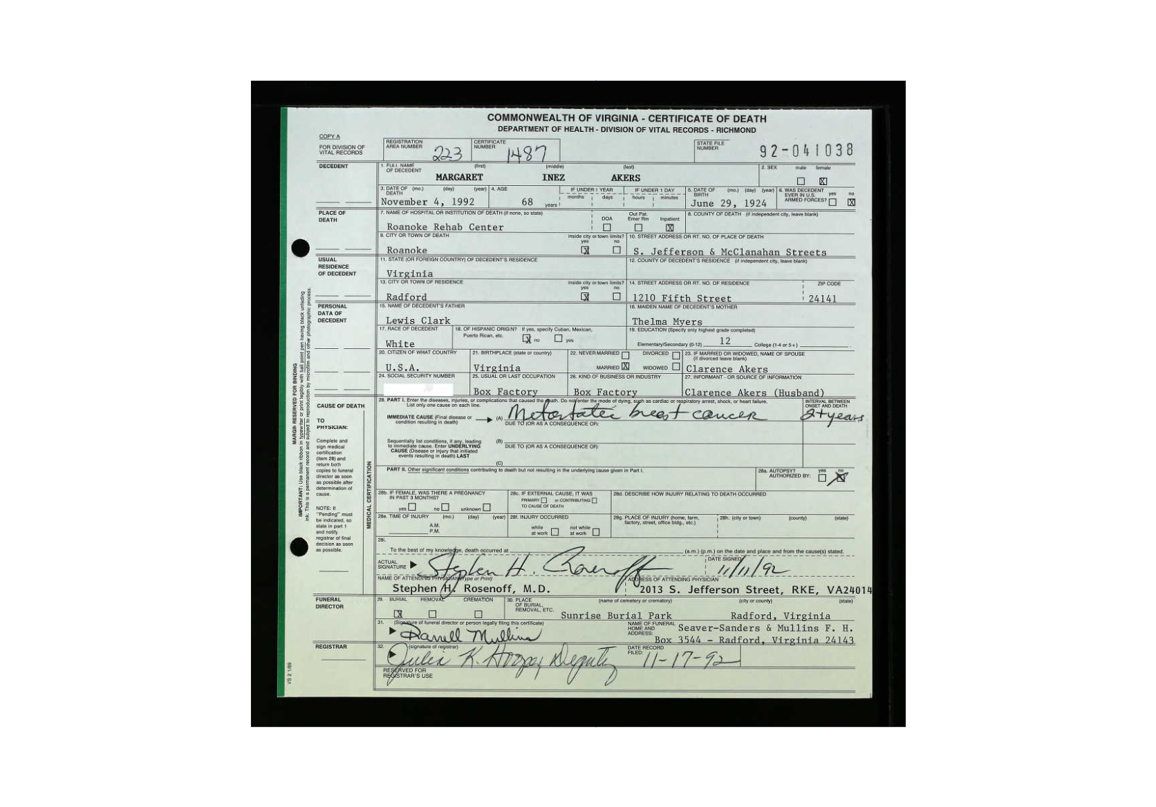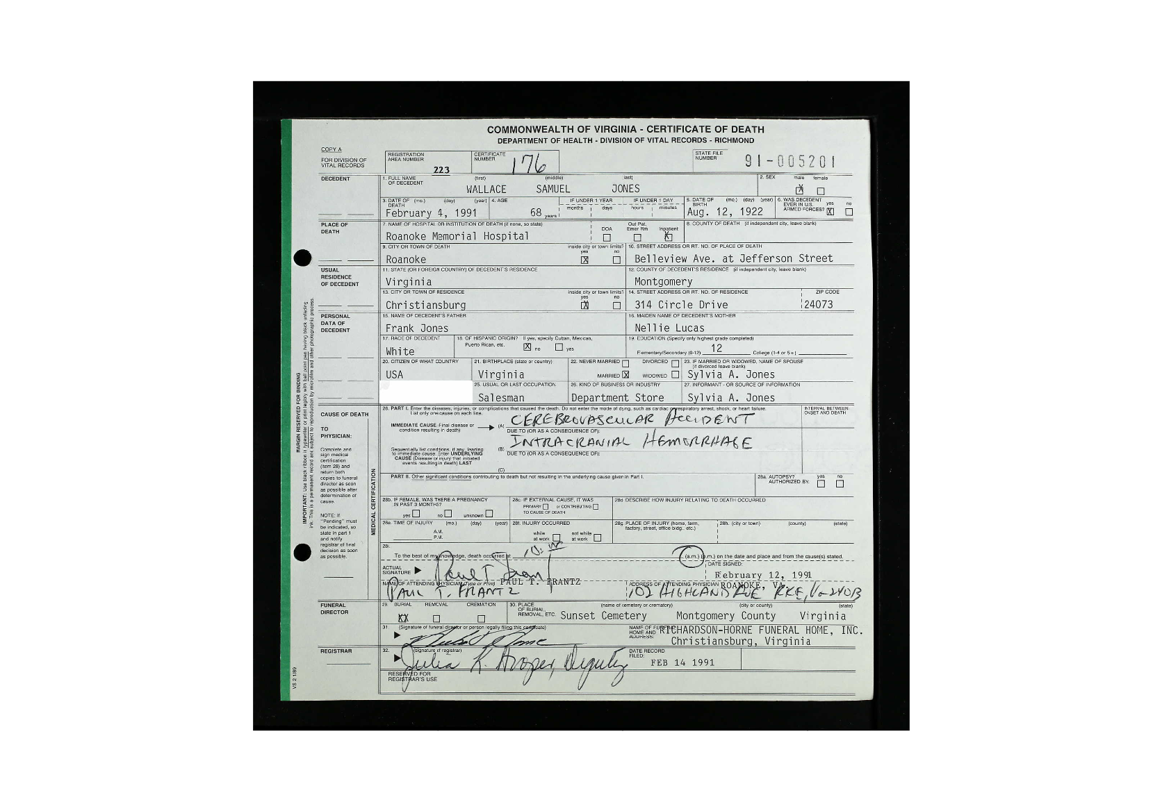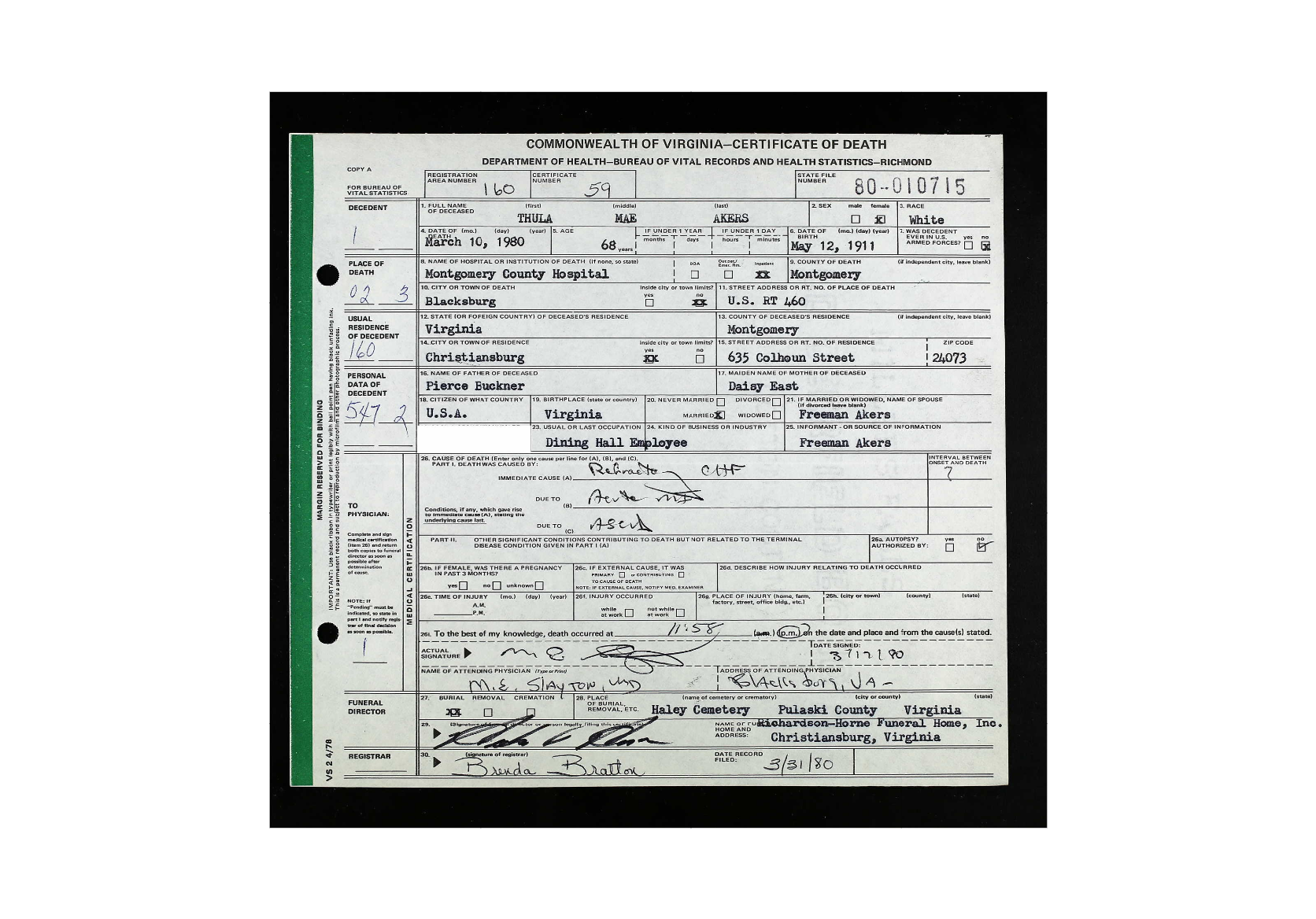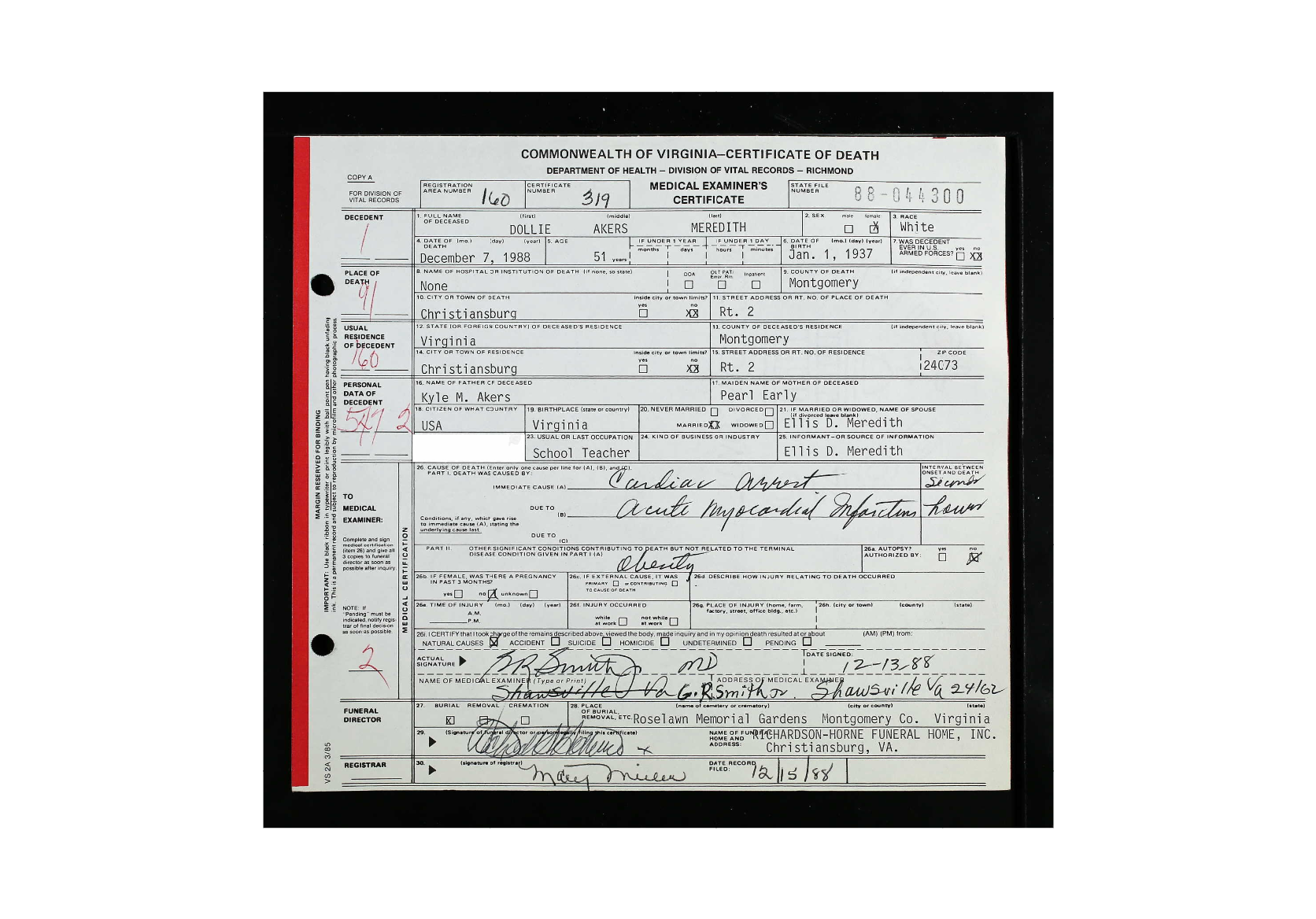 Virginia · Monday, April 08, 1974 1998 Death: 2-11-1998 Roanoke, VA. [Death Cert]